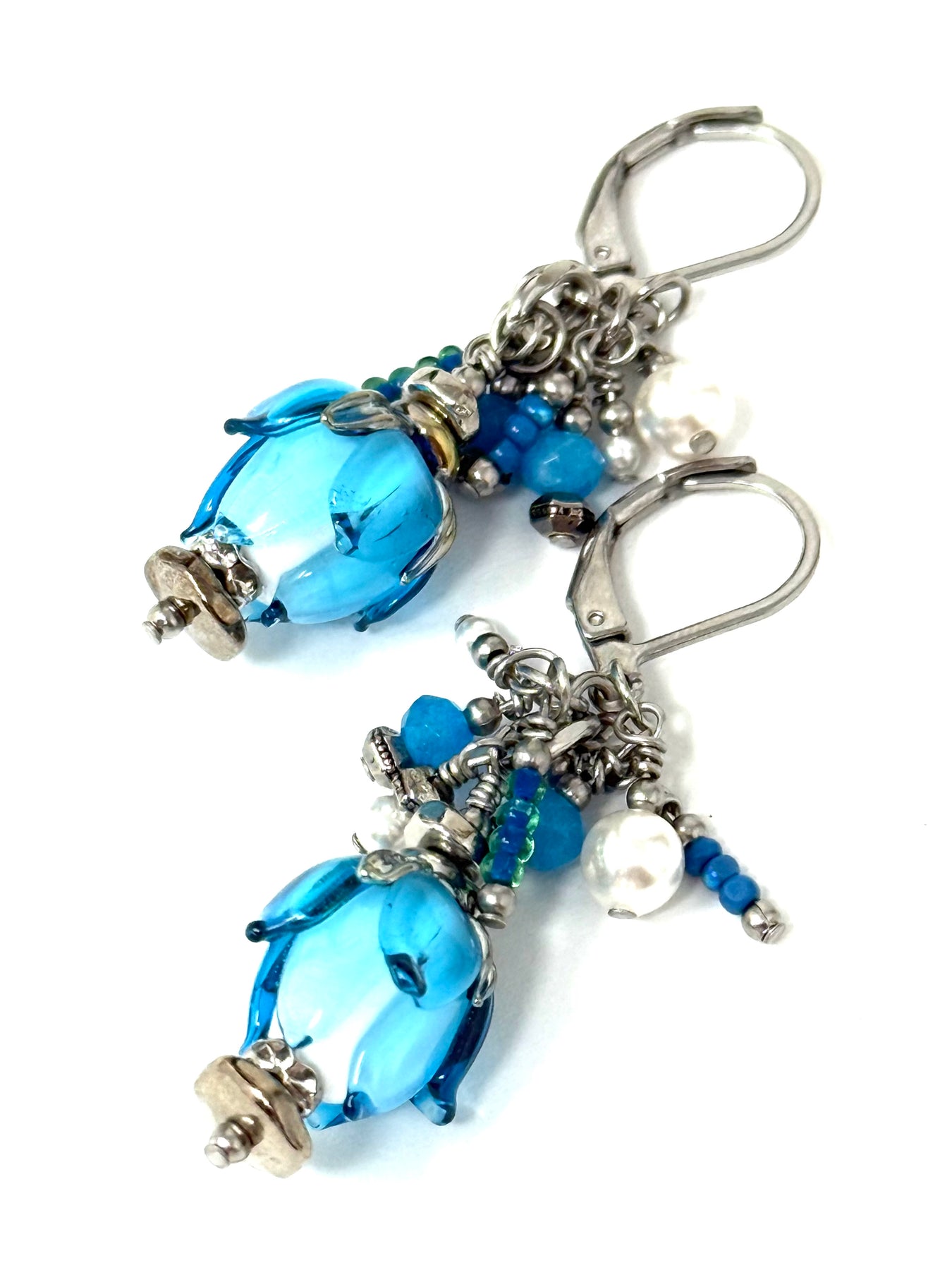 Above each focal bead cascades an intricate cluster of faceted turquoise blue jade gemstones, white Swarovski pearls, and glass chateau seed beads in coordinating turquoise, blue, and silver tones. Each tiny bead is meticulously hand-set to create the playful cascading design, with the faceted jade gemstones adding brilliant sparkle and the lustrous white pearls providing elegant contrast. The stainless steel lever back ear wires ensure a secure, comfortable fit and are hypoallergenic and nickel-free for sensitive ears. The vibrant color palette and fun beaded clusters make these earrings perfect for adding a pop of color to your everyday look—ideal for brunch dates, beach days, summer events, or brightening up casual outfits.