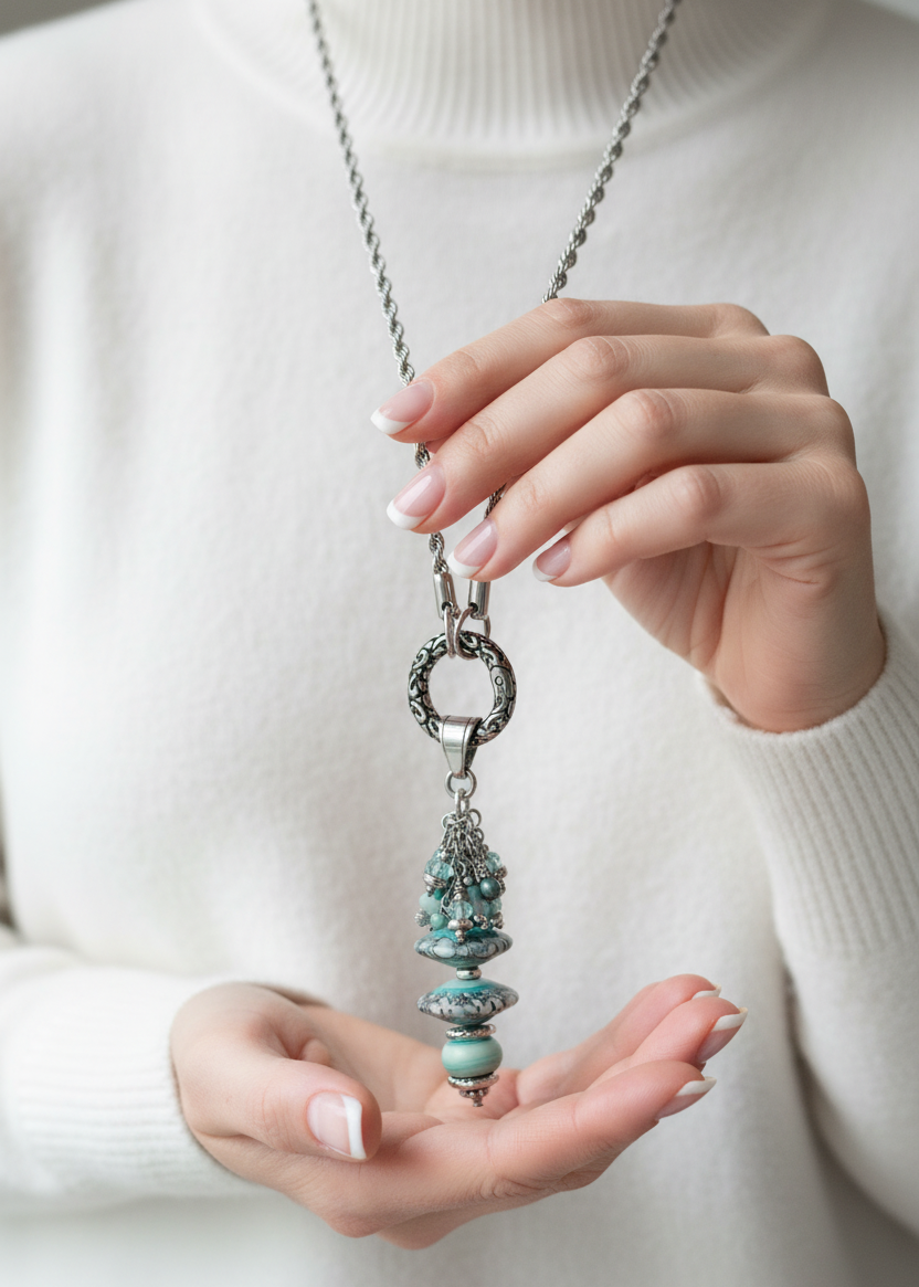 - Setting & Bezel: Silver-tone components and stainless steel bail that complement the coastal color palette