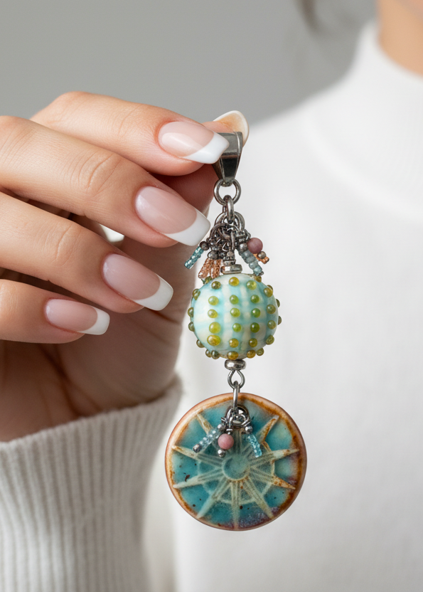 - Dimensions: Porcelain sun focal approximately 1.25" diameter; total pendant length including bail and lampwork bead approximately 3"