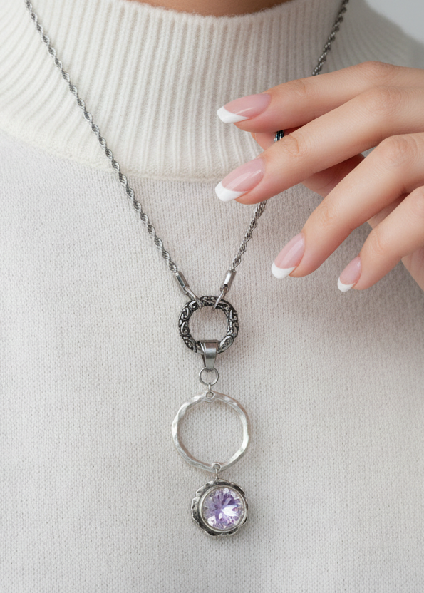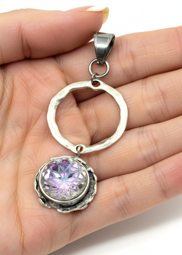 This enchanting Austrian Crystal Pendant showcases a stunning faceted lavender crystal set in a unique hammered pewter bezel with an ornate circular ring design. The textured metalwork creates beautiful depth and dimension, while the crystal catches light from every angle with brilliant sparkle.