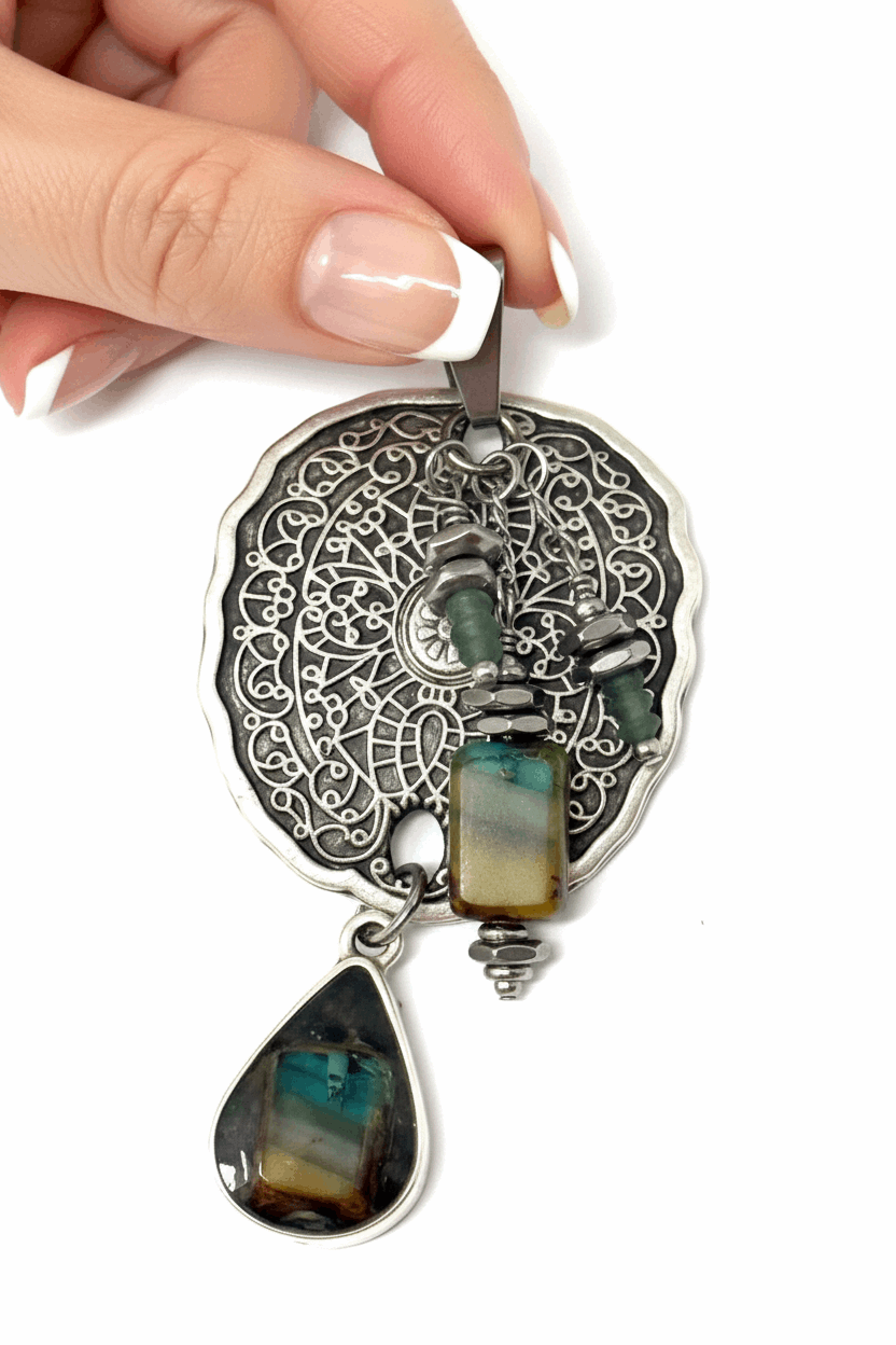 Bohemian elegance meets artisan craftsmanship in this captivating Boho Pendant Czech Glass, a mesmerizing one-of-a-kind work of wearable art. The pendant features an exquisite ornate silver filigree circular medallion with intricate scrollwork and delicate openwork patterns that create stunning dimensional beauty, centered with a luminous iridescent labradorite or abalone accent that flashes with mystical blue-green shimmer. Suspended below is a gorgeous faceted Czech glass teardrop in rich teal and green iridescent tones that catches the light like a precious gemstone, creating a beautiful cascading effect with graceful movement.