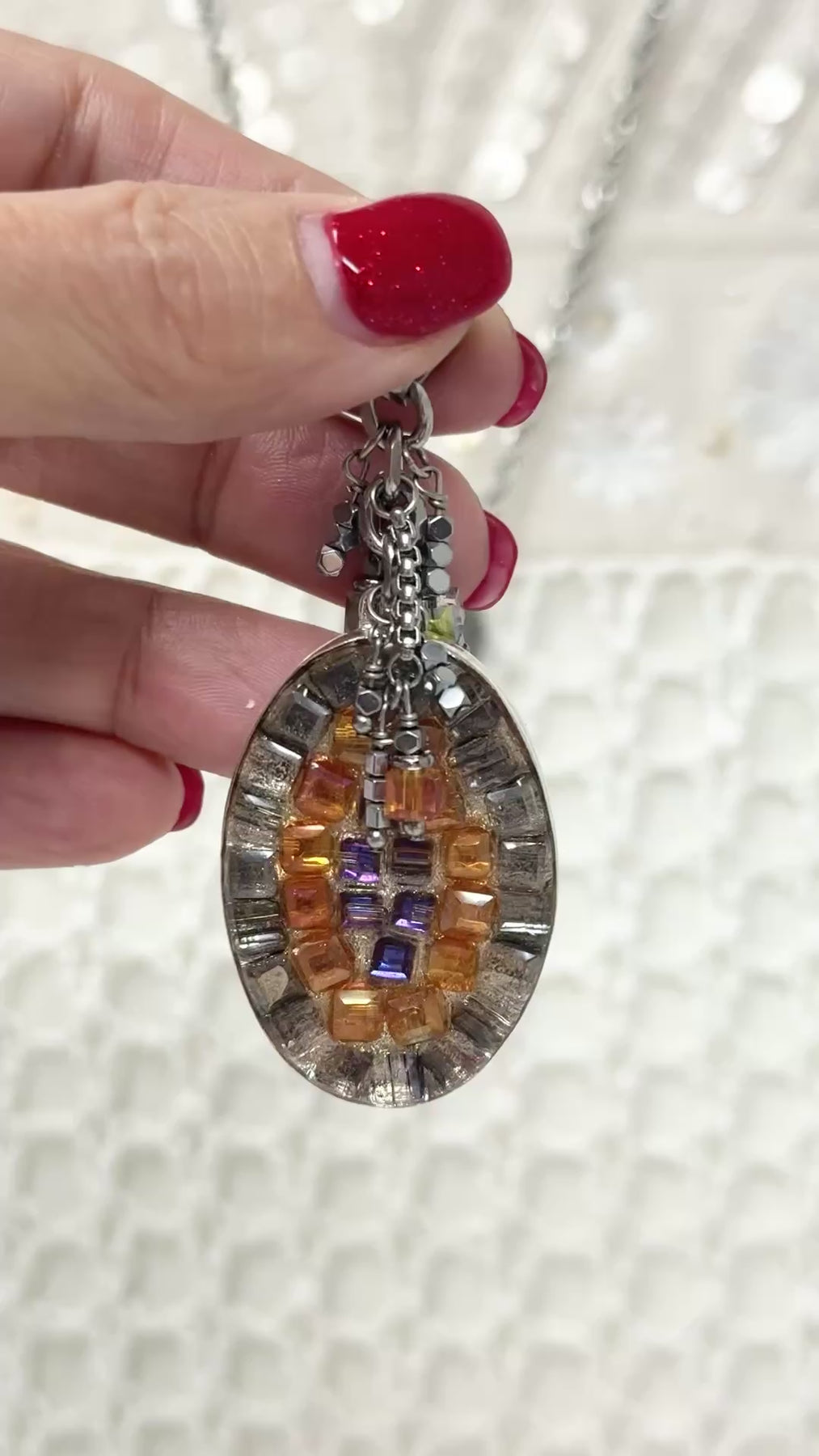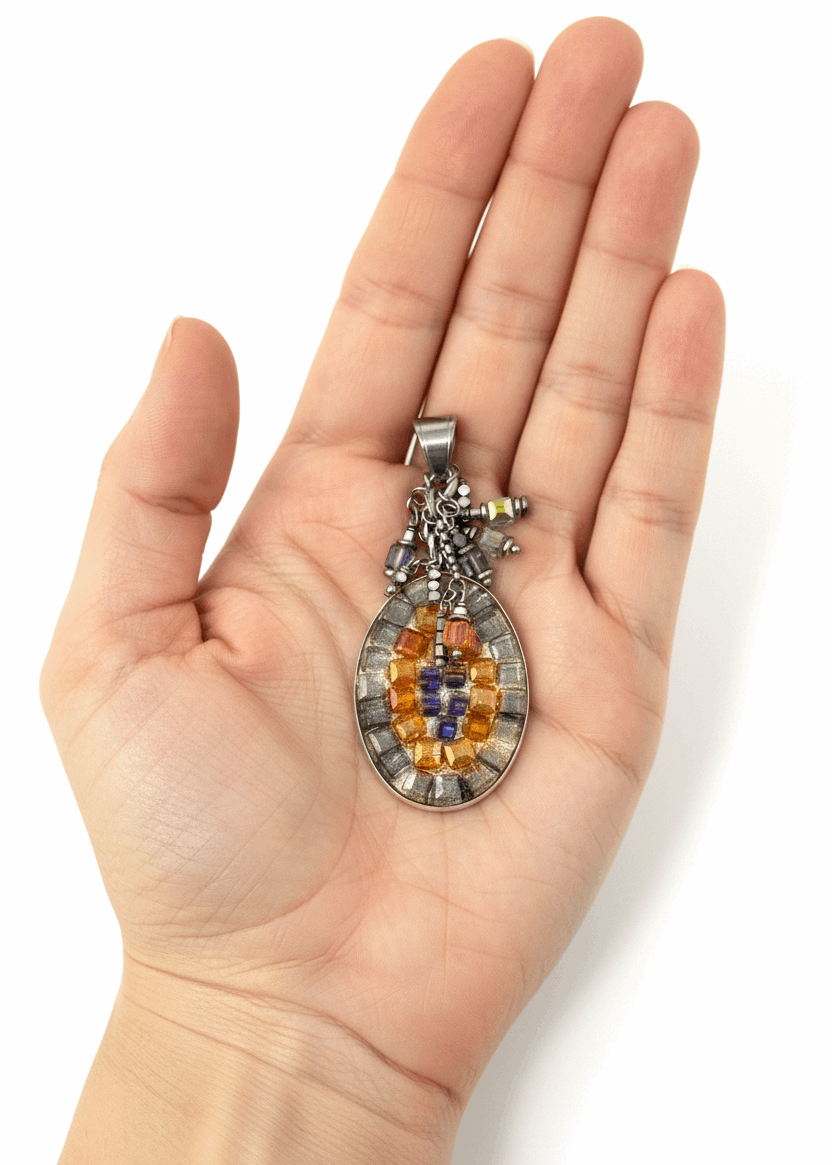• Focal Design: Silver filigree oval frame filled with vibrant orange, yellow, purple, green, and pink gemstone chips arranged in a beautiful mosaic pattern