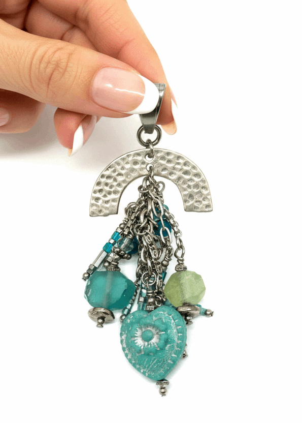 Boho Czech Glass Heart Cluster Dangle Pendant Sea Glass | Unique Artisan Jewelry #8200D