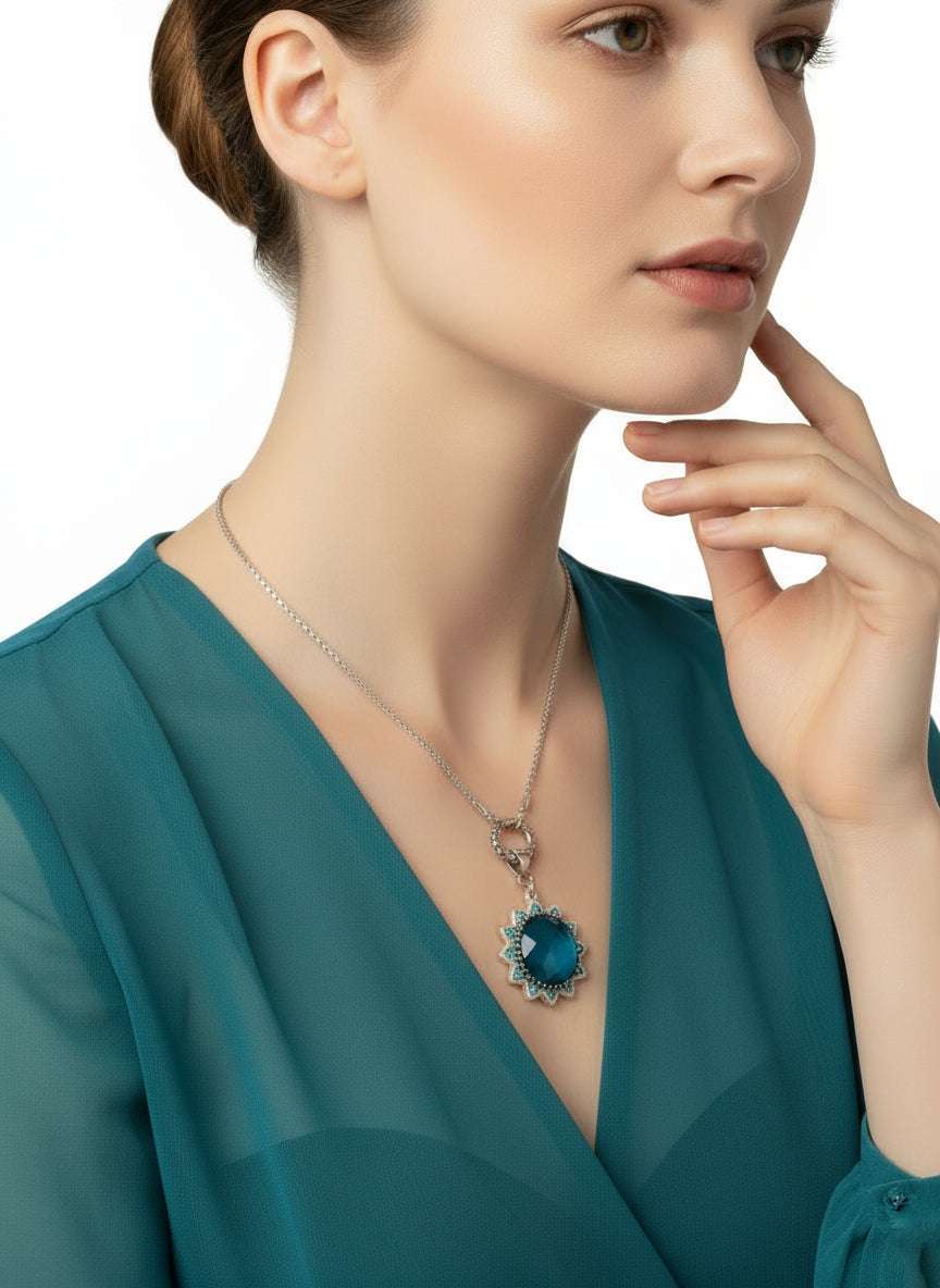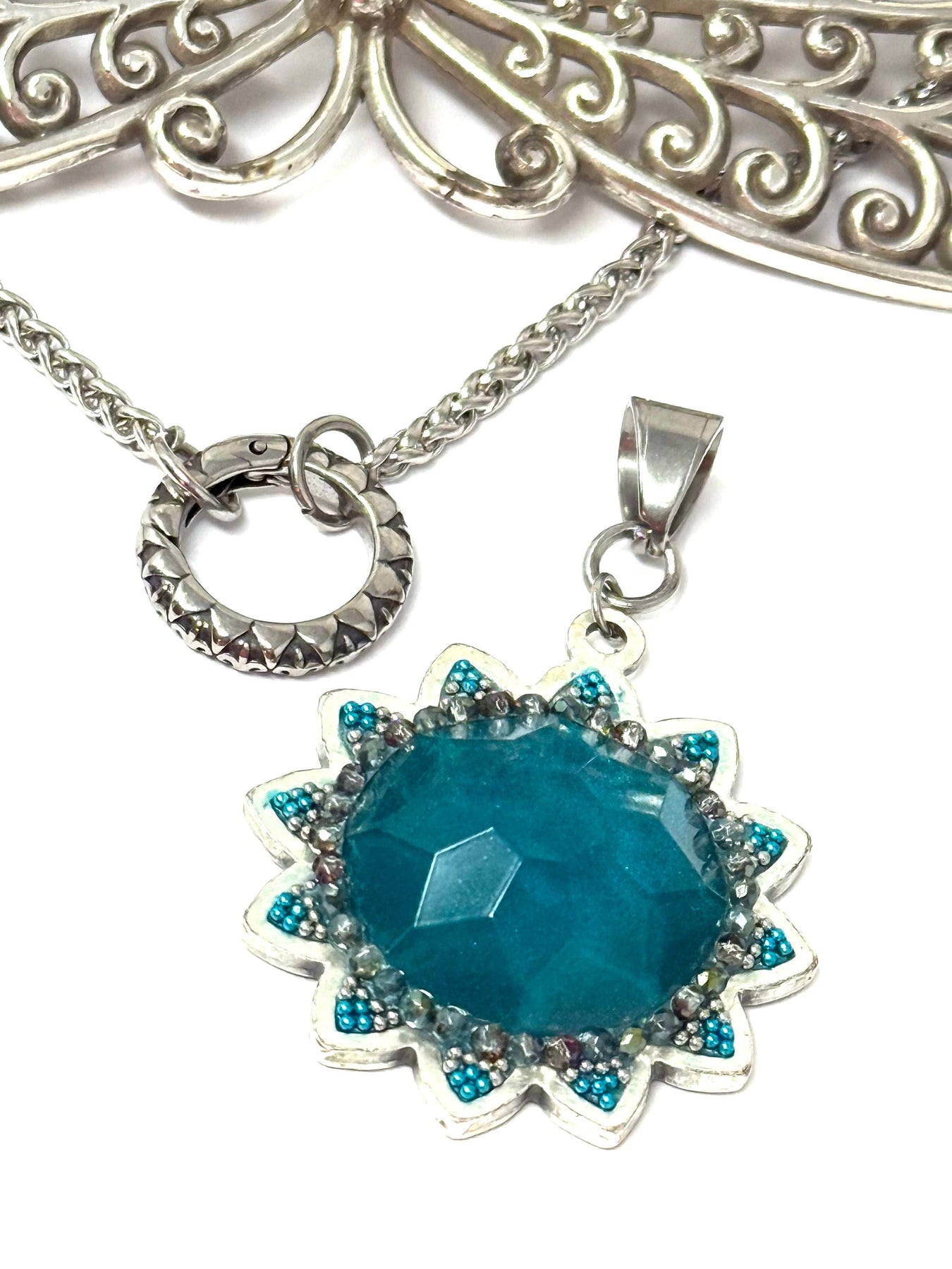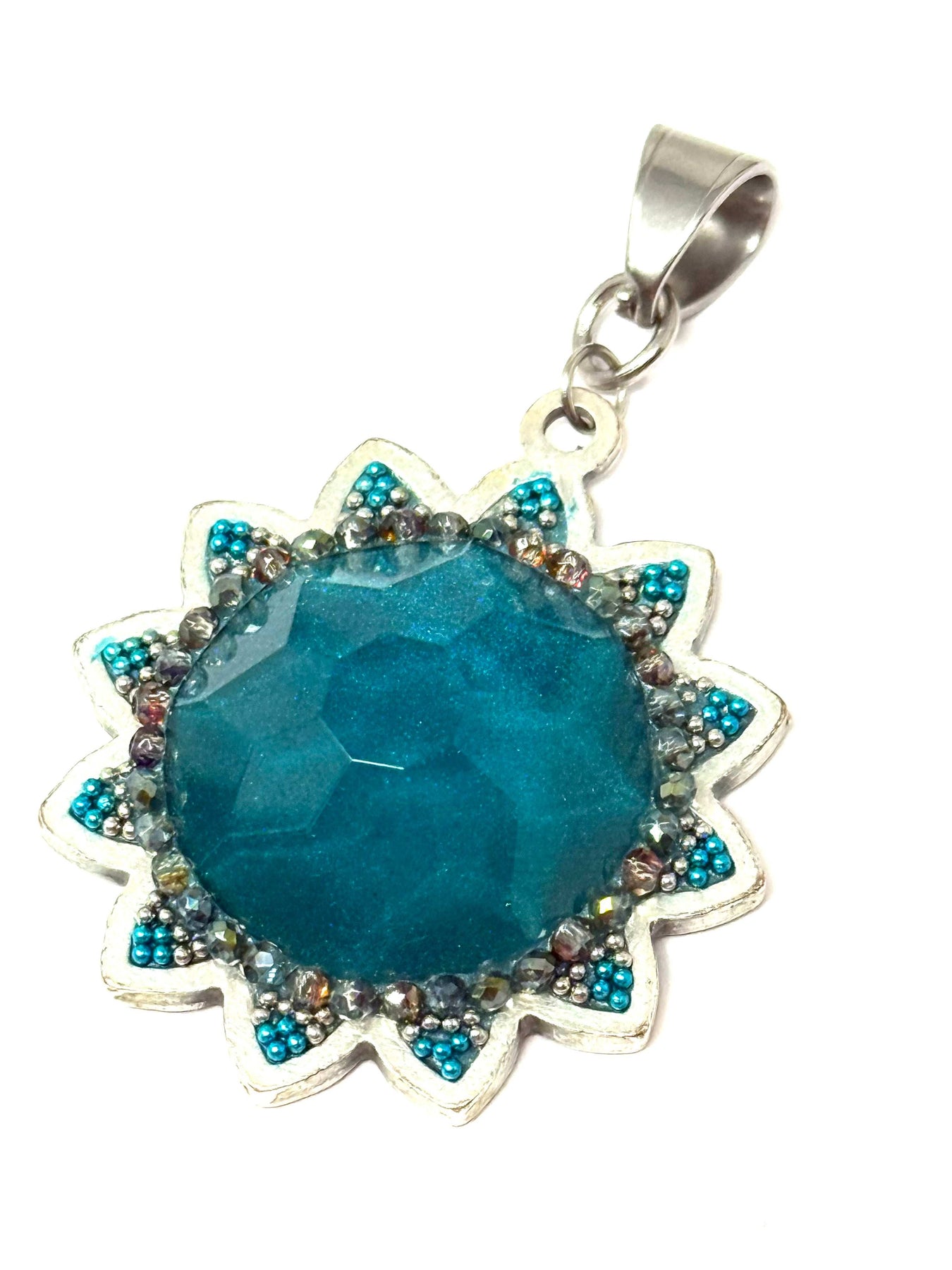 Radiant oceanic beauty shines in every detail of this stunning Tiny Pearl Glass Floral Pendant, a sophisticated one-of-a-kind work of wearable art. The dazzling sunburst design features a magnificent large faceted teal turquoise blue glass or crystal center that sparkles with brilliant clarity, surrounded by elegant silver sunburst rays adorned with sparkling teal turquoise rhinestones or crystals that radiate outward like rays of sunshine on water, creating a stunning double-sided design.