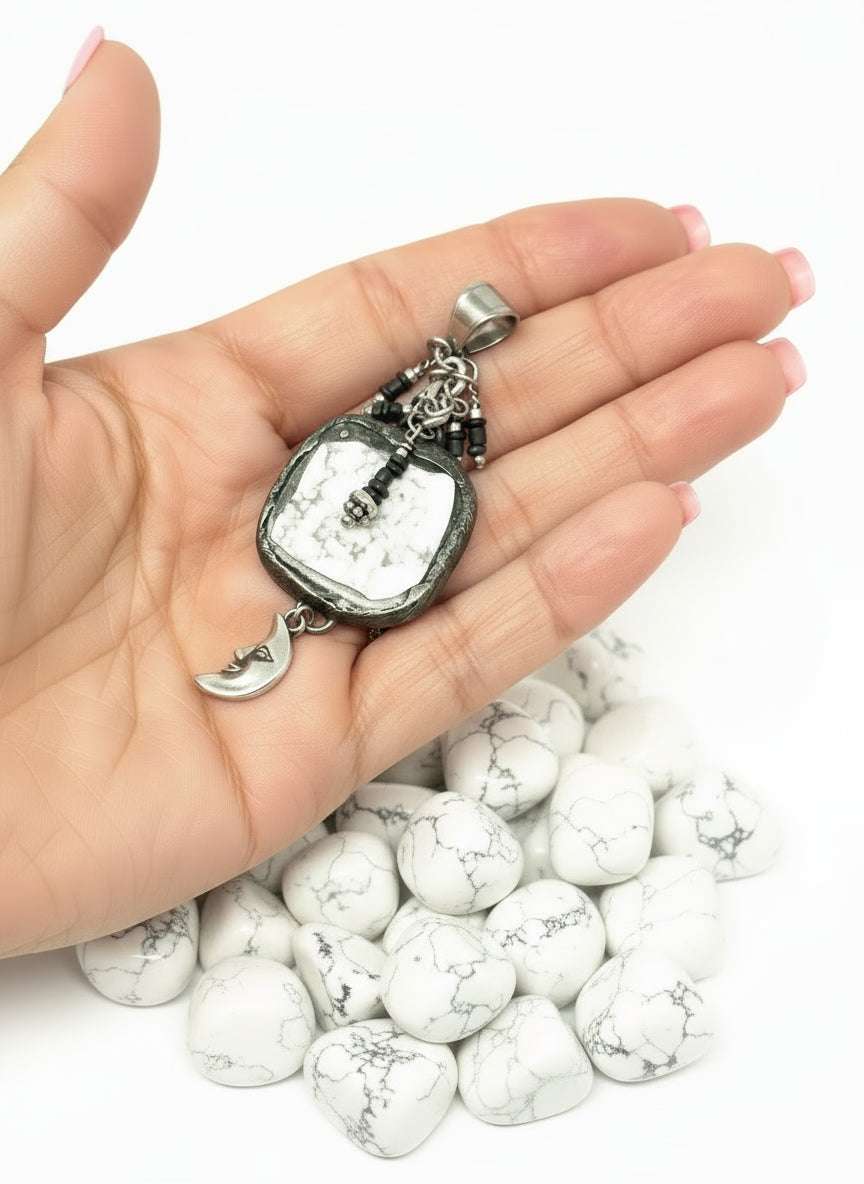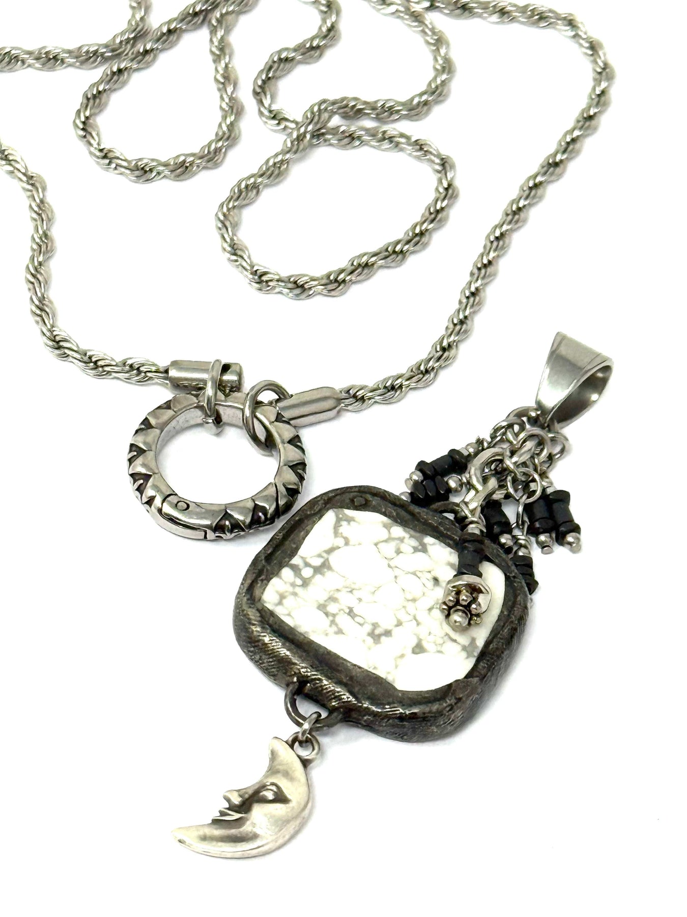 Focal Material: Features a genuine Handmade Howlite Gemstone Focal Bead set within an Antique Pewter Crescent Moon Bead.