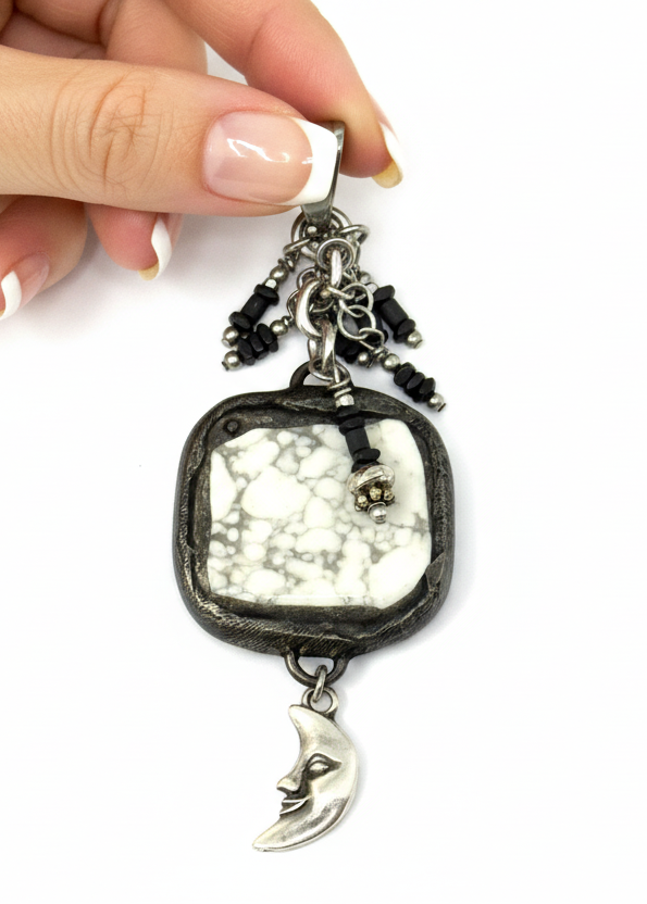 Artisan celestial crescent moon pendant worn as a statement piece, showcasing its mystical howlite gemstone and silver moon charm against a soft neutral background