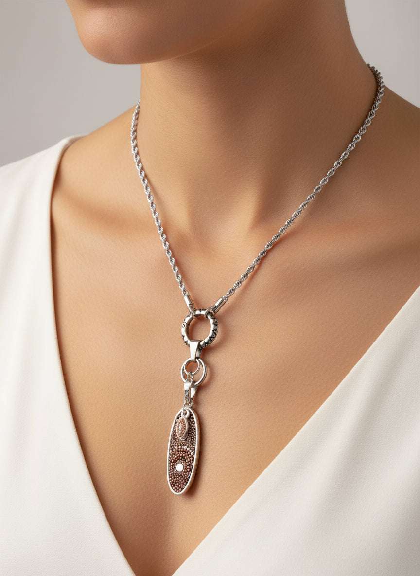 Warm metallic tones and artistic detail shine in this stunning Bronze Copper Seed Bead Mosaic Oval Pendant with Teardrop Charm, a gorgeous one-of-a-kind treasure. The elongated oval design features a mesmerizing seed bead mosaic in rich bronze, copper, and orange hues meticulously hand-set to create shimmering texture, accented with two elegant circular cutouts that add architectural interest, and finished with a delicate pink crystal teardrop charm that dangles gracefully for a romantic, feminine touch.