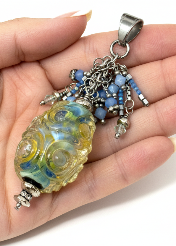 Luminous artistry and ocean-inspired beauty flow together in this captivating Lampwork Glass and Pearl Cascading Pendant, a breathtaking one-of-a-kind treasure. The exquisite handcrafted lampwork glass focal bead features mesmerizing swirls of pale yellow and soft green with delicate blue accents, creating an ethereal sea glass effect that seems to glow from within, crowned with a luxurious cascading cluster of light blue seed beads, shimmering crystals, and lustrous pearls that dance and sparkle with every movement like sunlight on water.