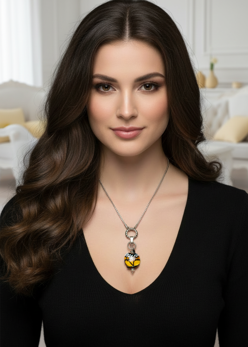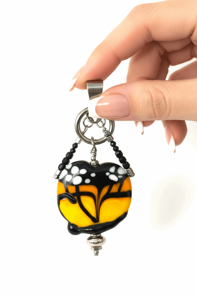 This playful pendant brings nature's beauty to life with a stunning handcrafted lampwork glass butterfly wing in vibrant yellow, orange, black, and white. The lampwork focal bead features intricate detailing that mimics the delicate patterns of a real butterfly wing, with hand-swirled glass creating organic flowing lines and dimensional texture. The glossy finish catches light beautifully, making the colors shimmer and glow with every movement.