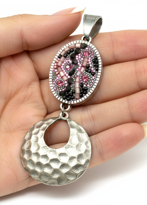 - Focal Bead: Two-part pendant design featuring elegant oval with intricate pink, mauve, and purple seed bead mosaic in beautiful swirling pattern framed by delicate silver beaded border, connected by silver chain to stunning circular hammered silver disc with artistic cutout circle design