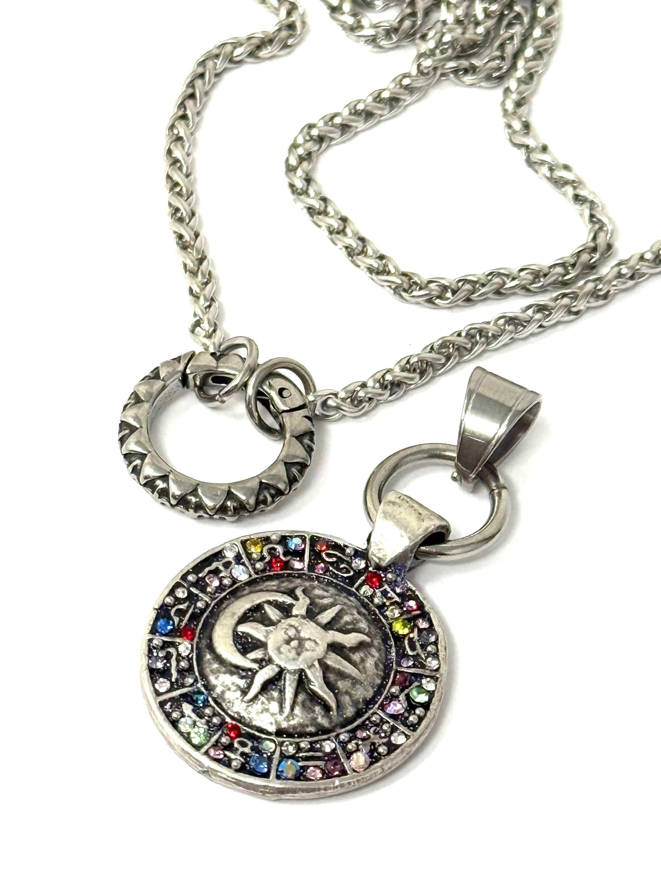 Focal Material: Features a beautiful Multi-Color Swarovski Crystal focal bead set within an Antique Pewter Sun/Moon Focal Bead.