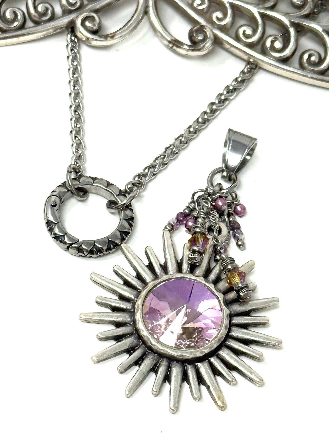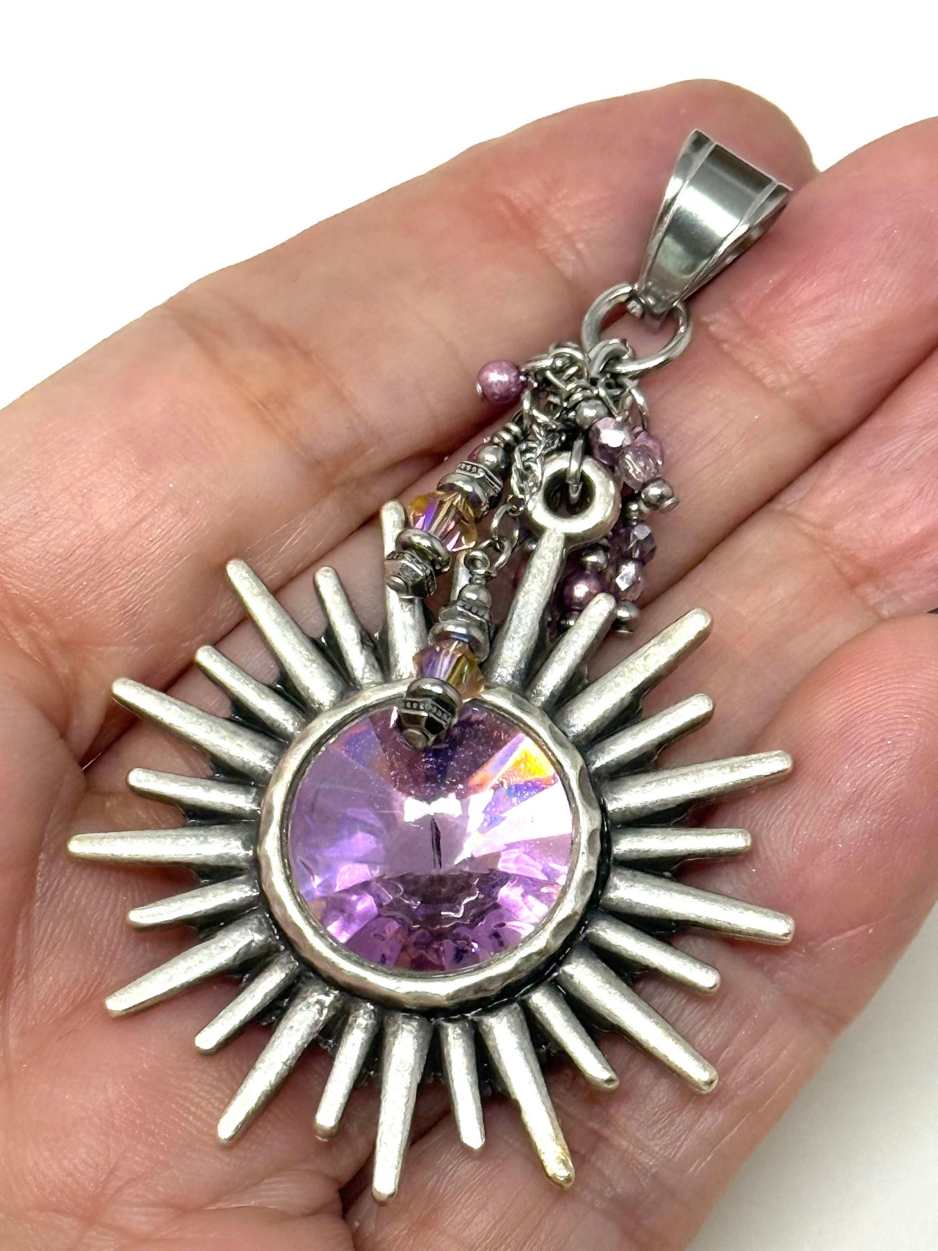 Oxidized antique pewter sun pendant with a pink rainbow faceted crystal focal bead, adorned with dangling pink and purple seed beads and Swarovski crystals.