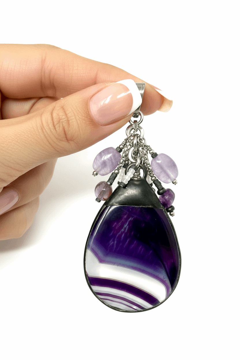 A mesmerizing blend of royal hues and natural beauty, this striking Purple Agate Cluster Pendant is a stunning, multi-color work of wearable art. It features a genuine Purple Agate Gemstone Focal Bead complemented by delicate cluster beads that add texture and depth. Securely set in an Antique Silver Bezel, this handmade piece offers a versatile, artistic touch to any outfit, with colors that catch the light beautifully.