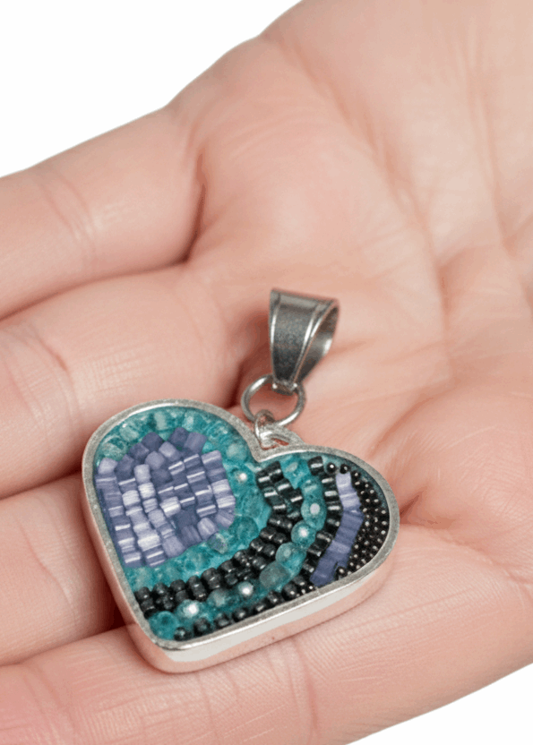 Focal Design: Heart-shaped pendant with intricate multicolor seed bead mosaic in gradient of teal, turquoise, lavender, black, and silver