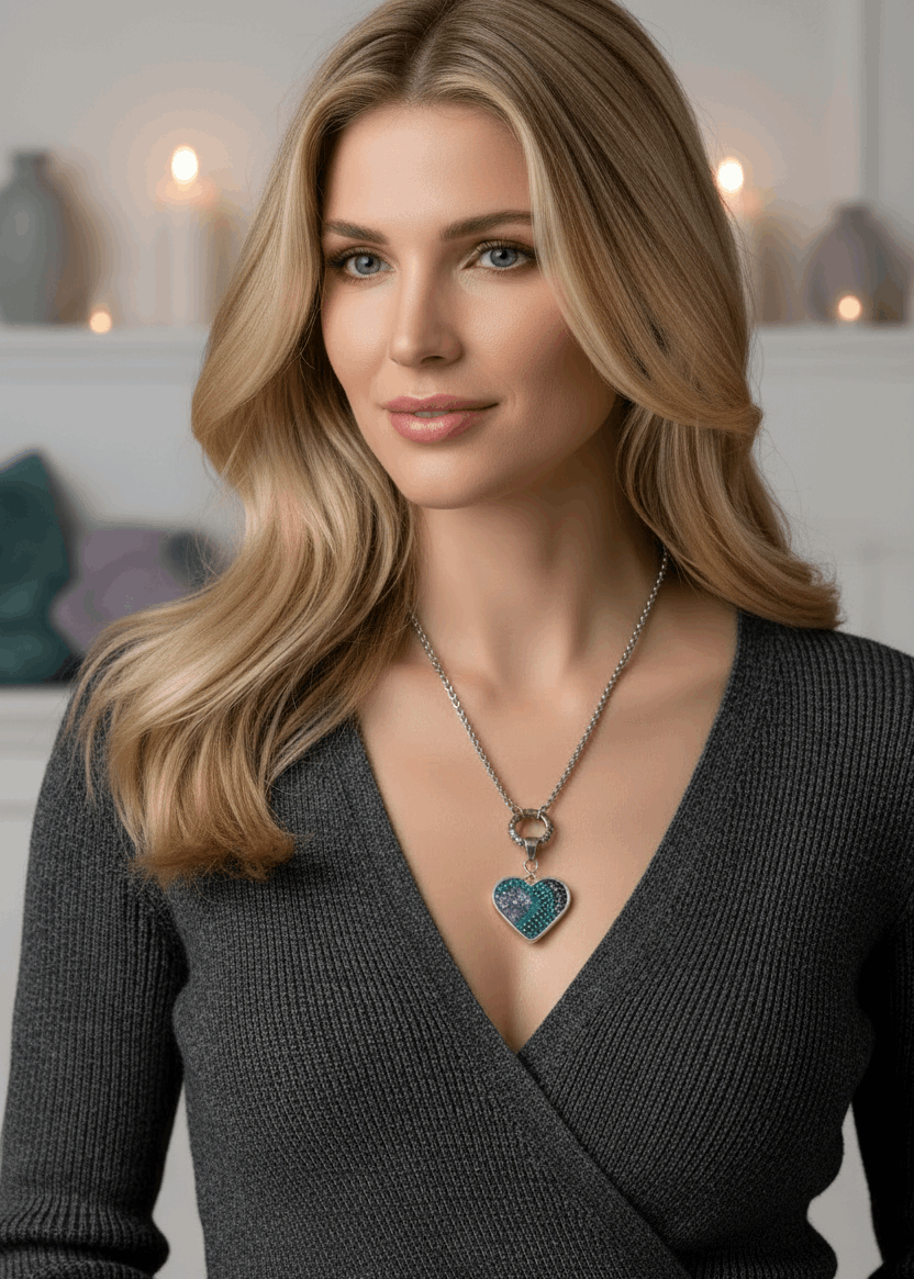 Securely set in an Antique Silver Heart Bezel, this handmade piece offers a versatile, artistic touch to any outfit, with vibrant ocean tones that radiate romantic charm.