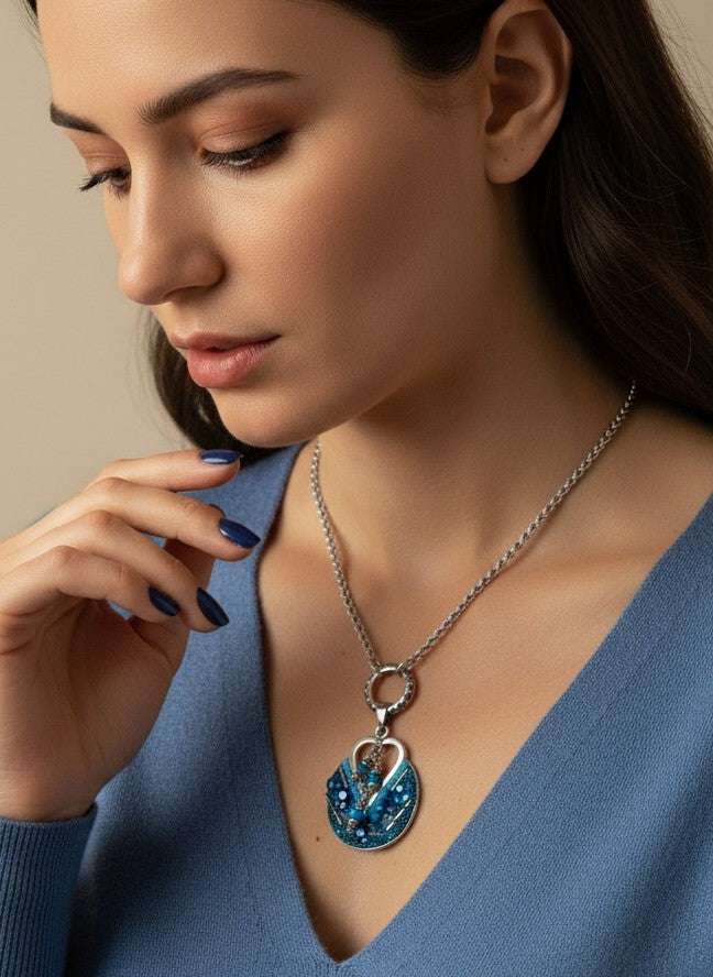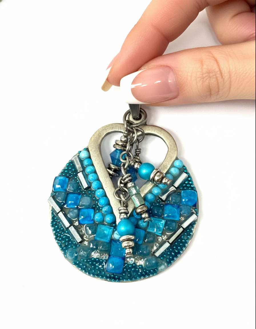 Shimmering ocean hues and luxurious gemstones create pure magic in this breathtaking Blue Agate Circular Pendant with Swarovski Crystals, an extraordinary one-of-a-kind masterpiece. The elegant circular design features genuine blue agate gemstones beautifully arranged with sparkling turquoise Swarovski square crystals, lustrous cream pearls, and sleek silver bugle beads, all meticulously hand-set with ornate turquoise blue accents that add sculptural dimension and radiant shimmer to this exquisite work of wearable art.
