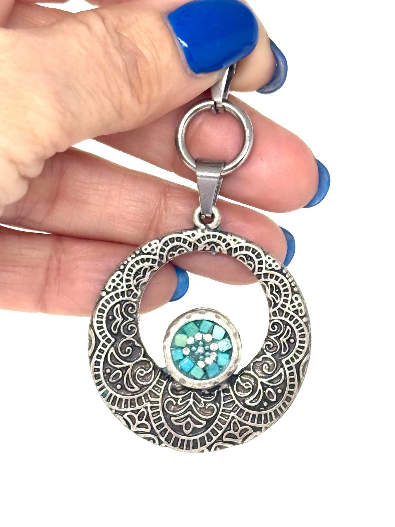 Indulge in this Handmade Turquoise Seed Bead Mosaic Reversible Pendant, a captivating piece that will awaken your senses and elevate your fashion sense. Its exclusive design and radiant shine are sure to capture attention.