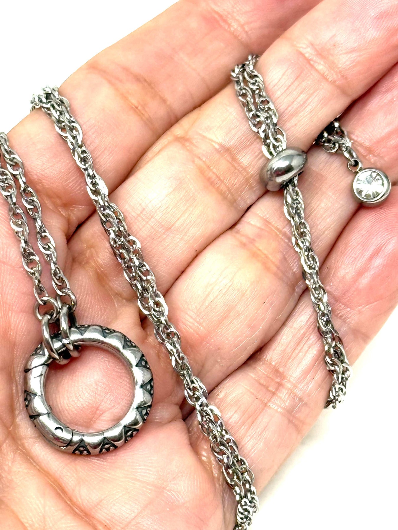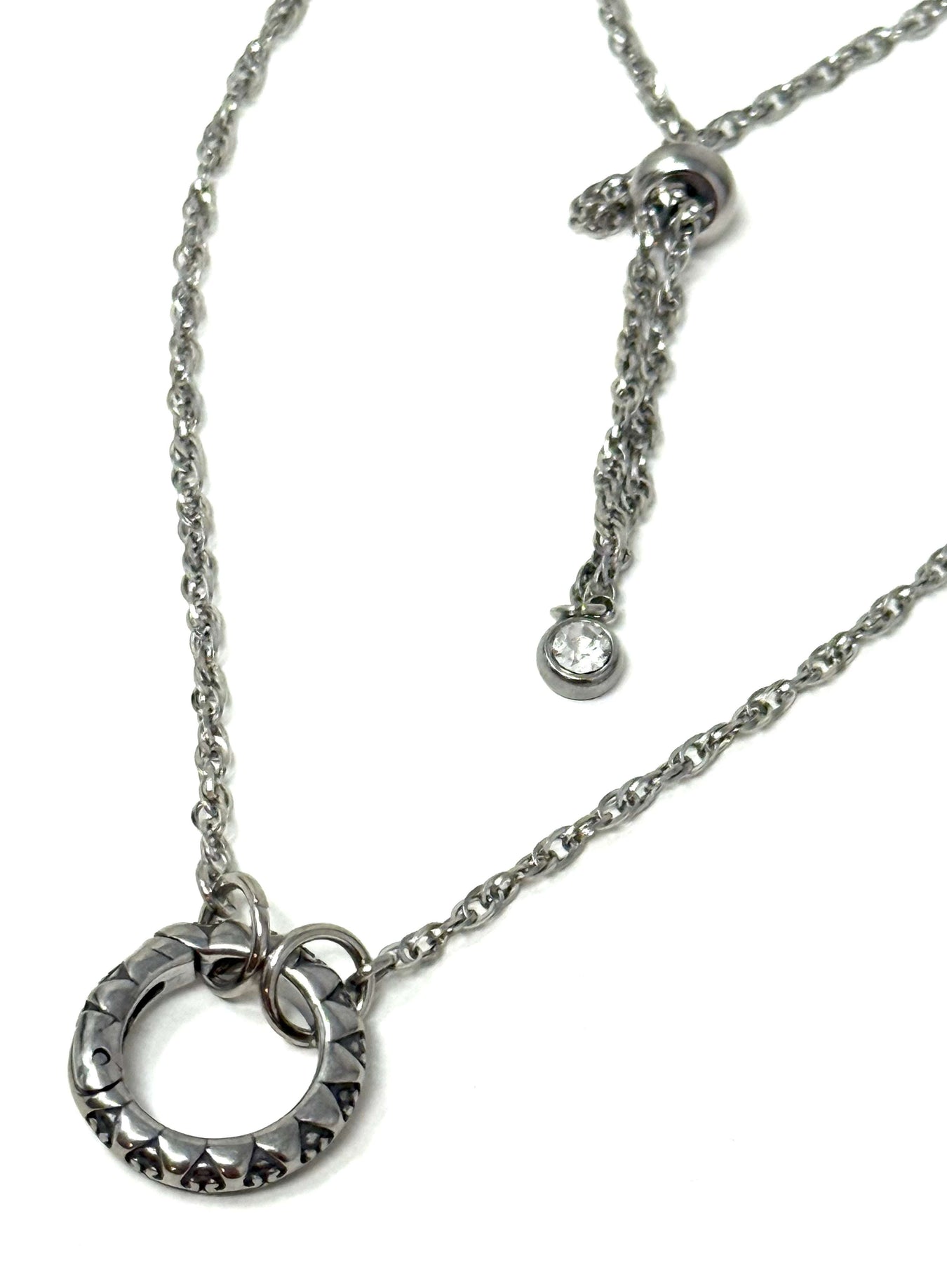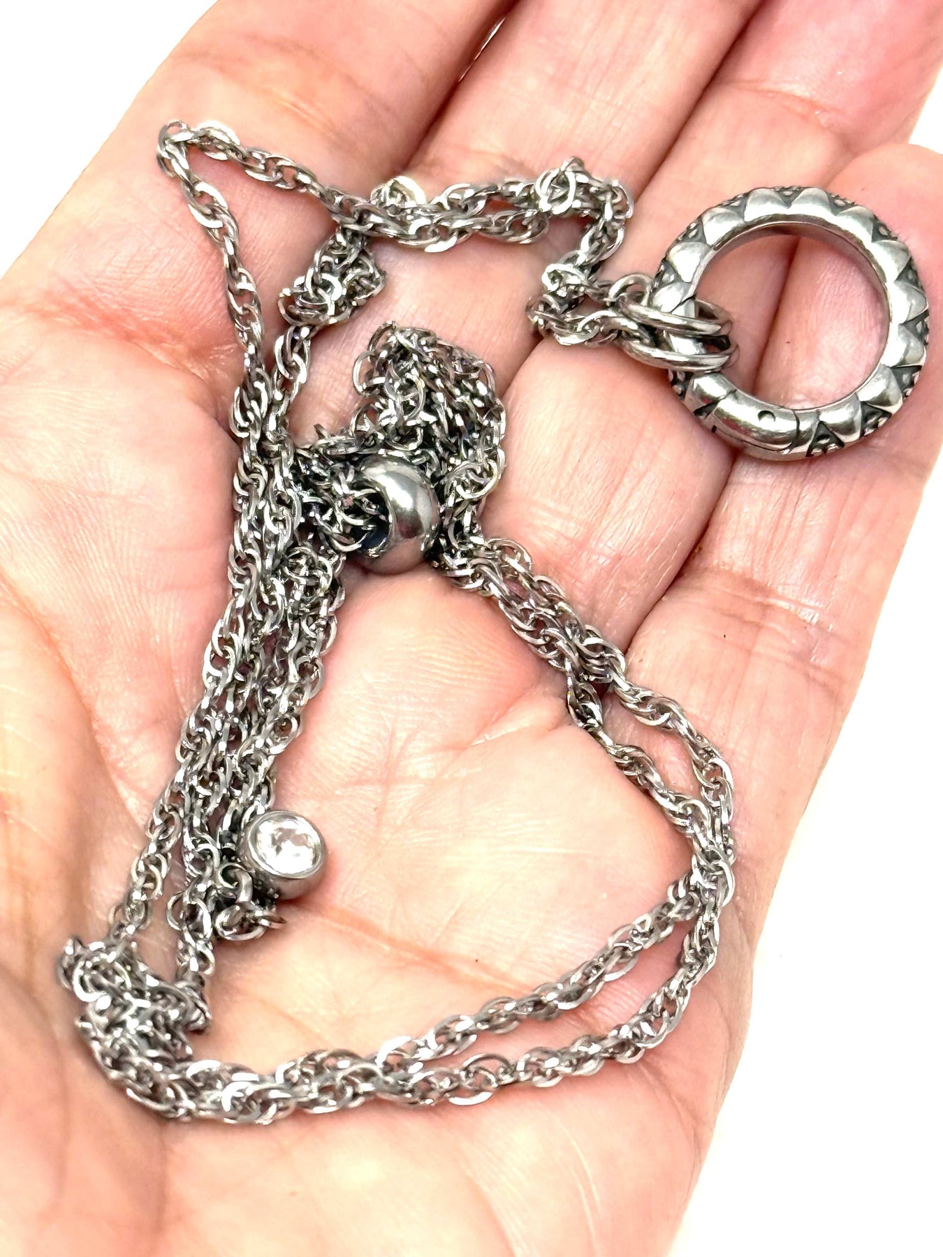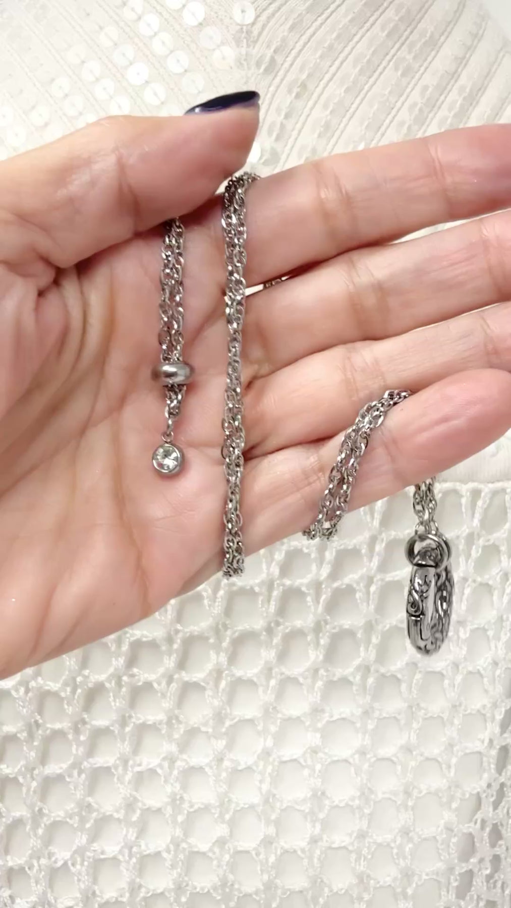 Long Adjustable Stainless Steel Lace Chain — Slip this chain over your head then easily slide the stainless steel ball up or down to achieve your perfect length. I've added a crystal to the back of every chain so you have something pretty sparkling down your back. Wear it full length at 28" inches or wear as short as 16 inches. This chain gives you the versatility of every length.