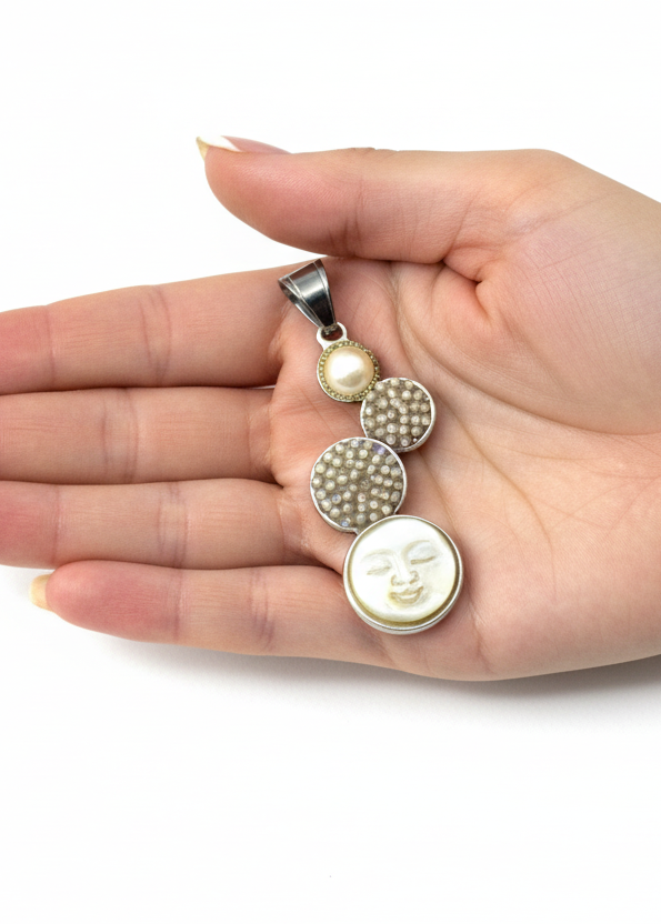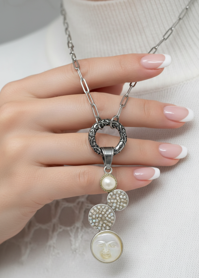 • Focal Gemstone: Features a hand-carved Mother of Pearl moon face in luminous cream shell with iridescent shimmer