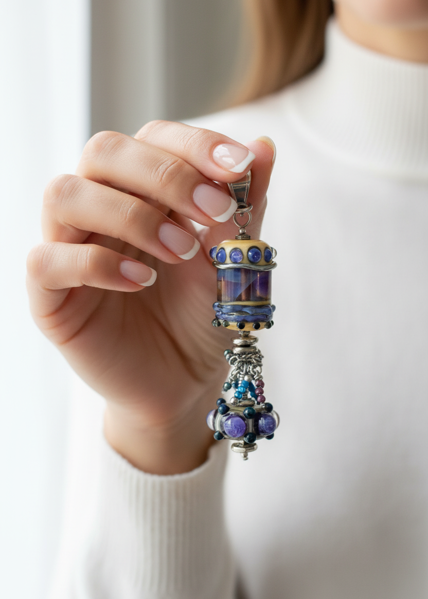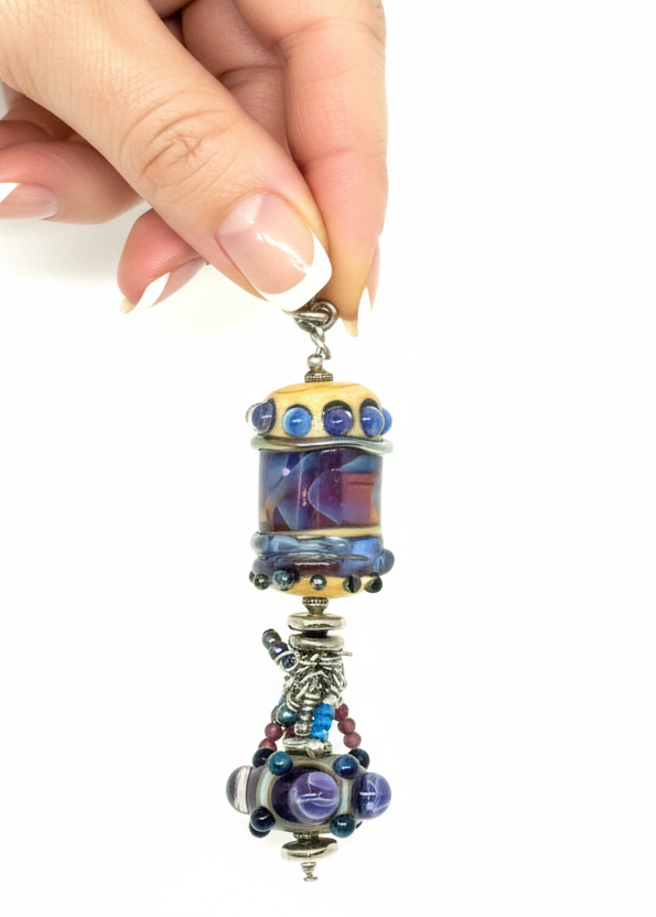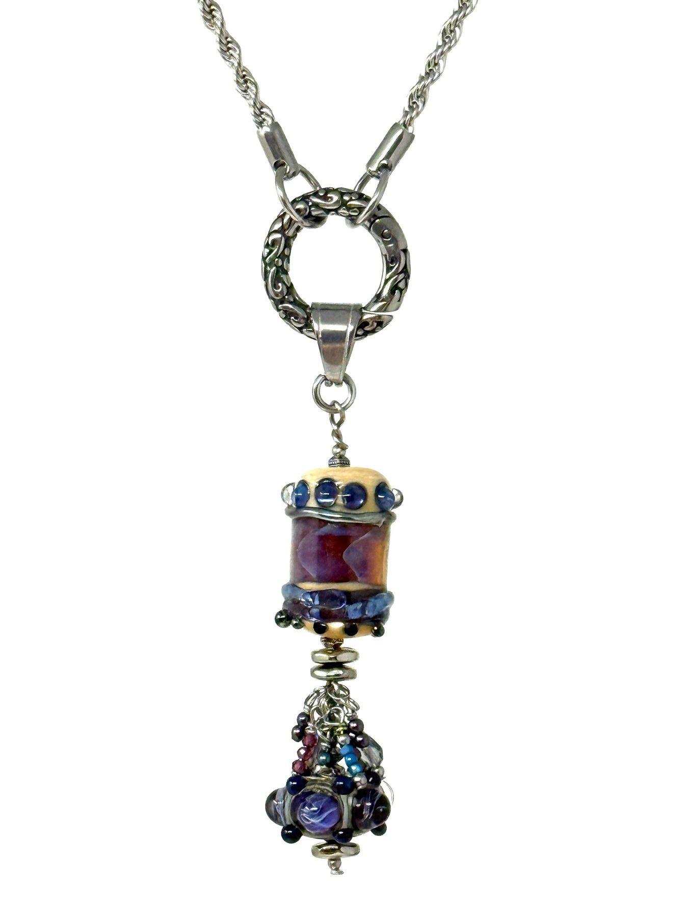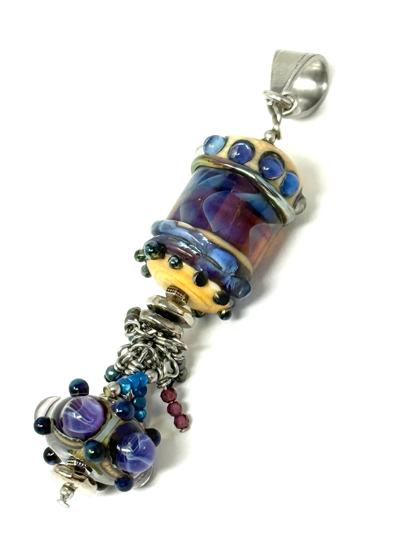The pendant features an intricate cascading beaded cluster in coordinating purple, blue, burgundy, and silver tones, accented with faceted ruby gemstones, chateau glass seed beads, and oxidized pewter spacers. Each element is carefully hand-selected to complement the bold lampwork focals, creating a cohesive, eye-catching design. The stainless steel bail ensures durability and a secure connection to your favorite chain. The rich jewel tones and dramatic length make this pendant perfect for gallery openings, evening events, or adding an artisan edge to everyday wear.
