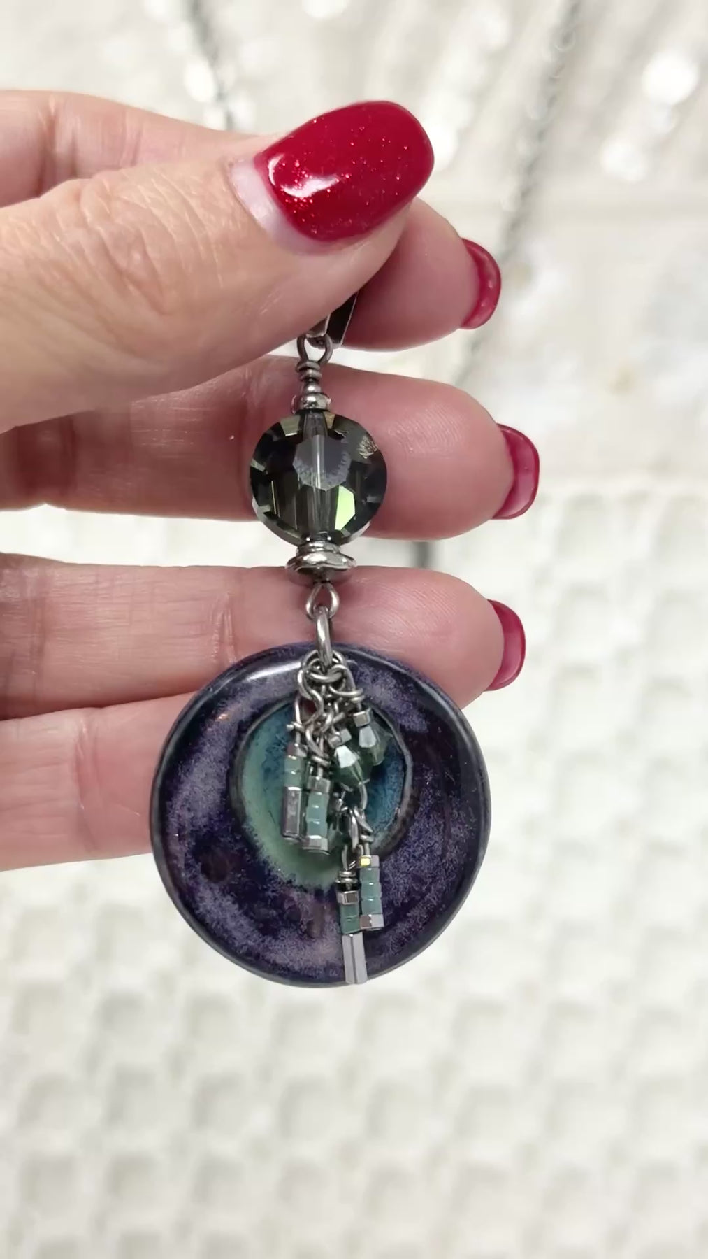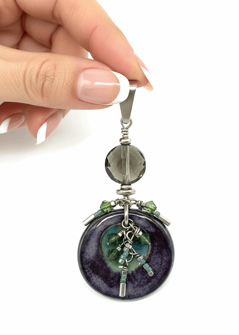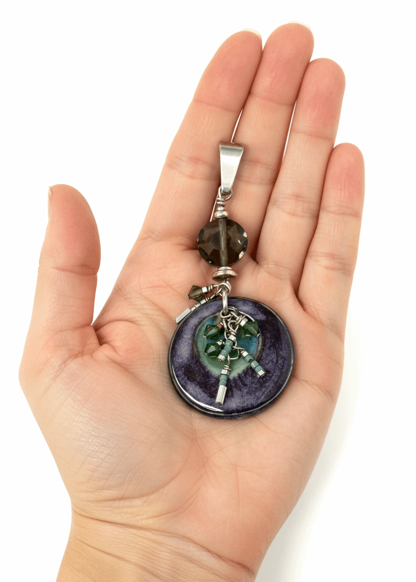Model holding boho porcelain and Swarovski crystal pendant showing scale and detail of purple circular disc with green and silver crystal cluster - one-of-a-kind jewelry by Bead Dangle Design