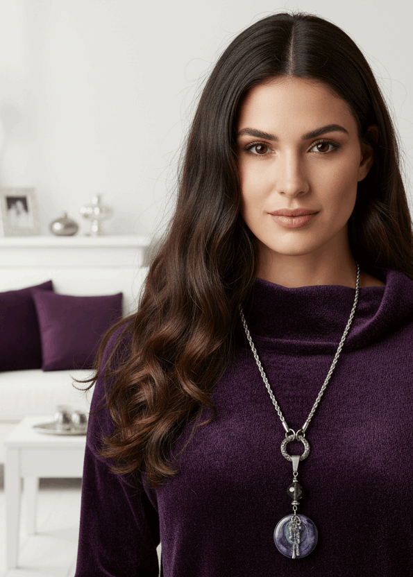 Artisan boho porcelain and Swarovski crystal pendant worn as a statement piece, showcasing its purple, green, and brown circular disc design against a soft neutral background