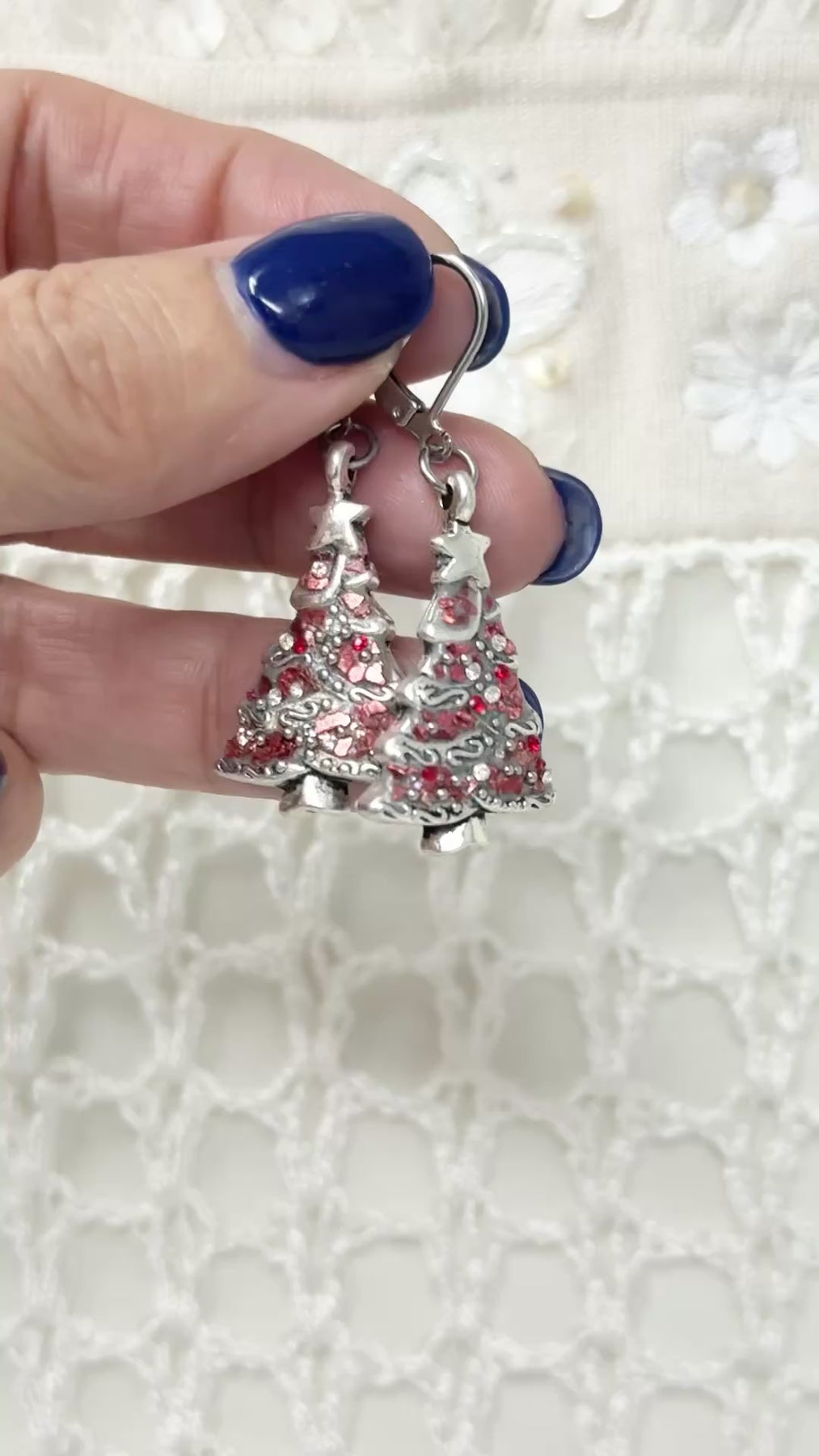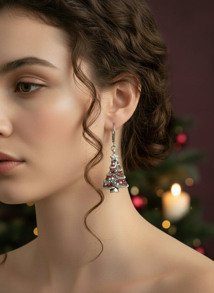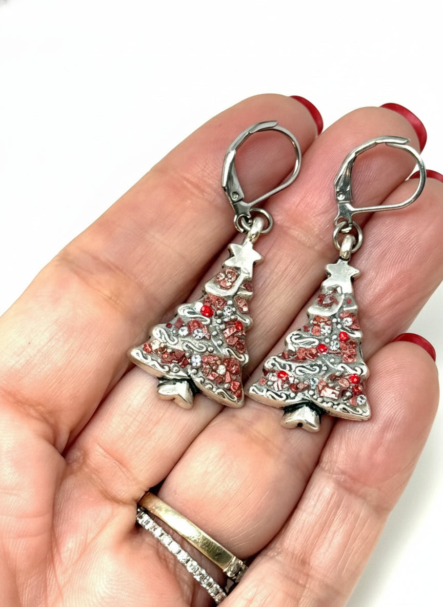 "These Christmas tree earrings are absolutely perfect for the holiday season! The antique oxidized finish gives them a vintage charm, while the red silver chips and Swarovski crystals add just the right amount of sparkle. They're surprisingly lightweight and comfortable - I can wear them all day at holiday parties without any discomfort. The leverback closures are so secure, I never worry about losing them."
