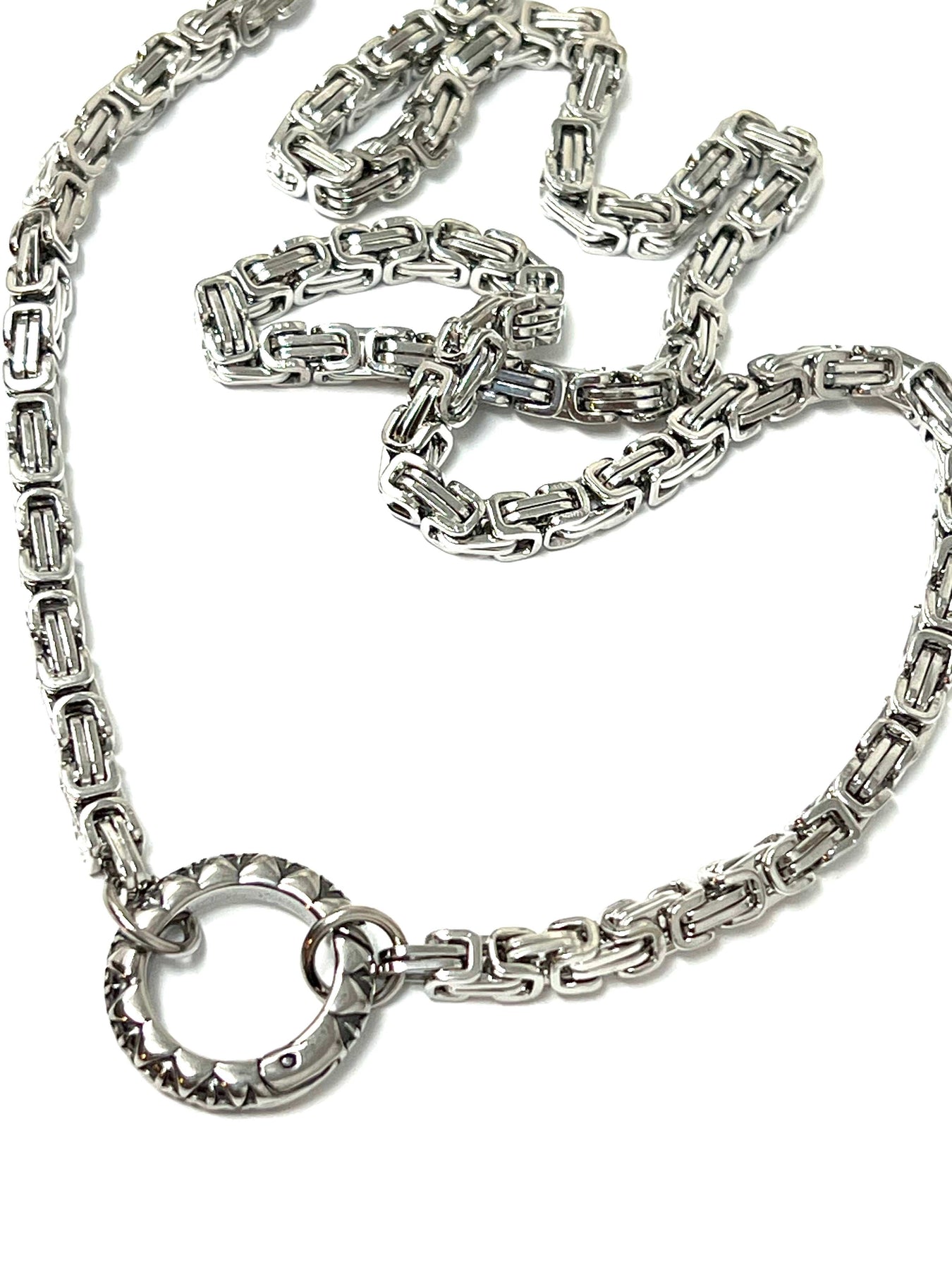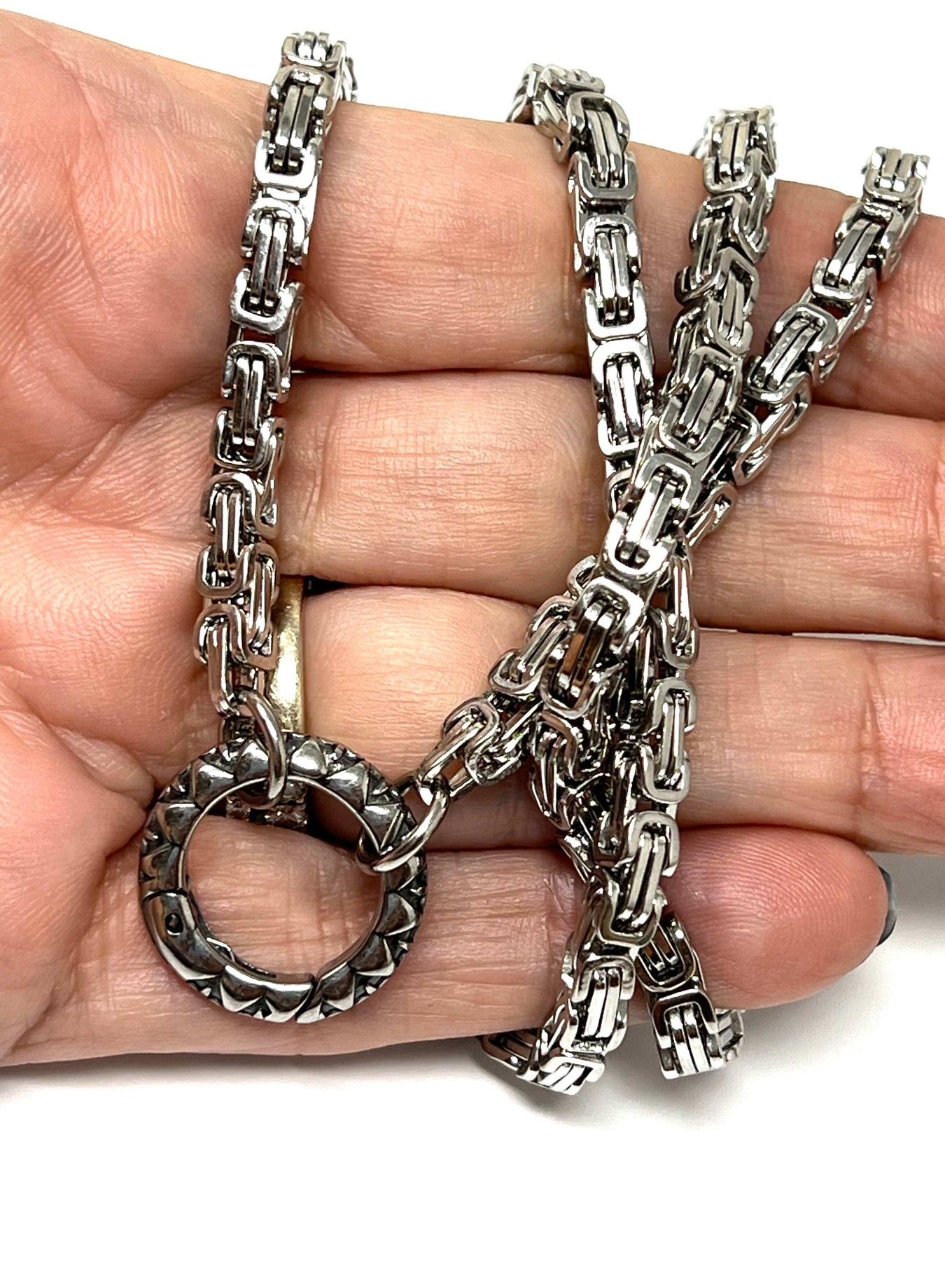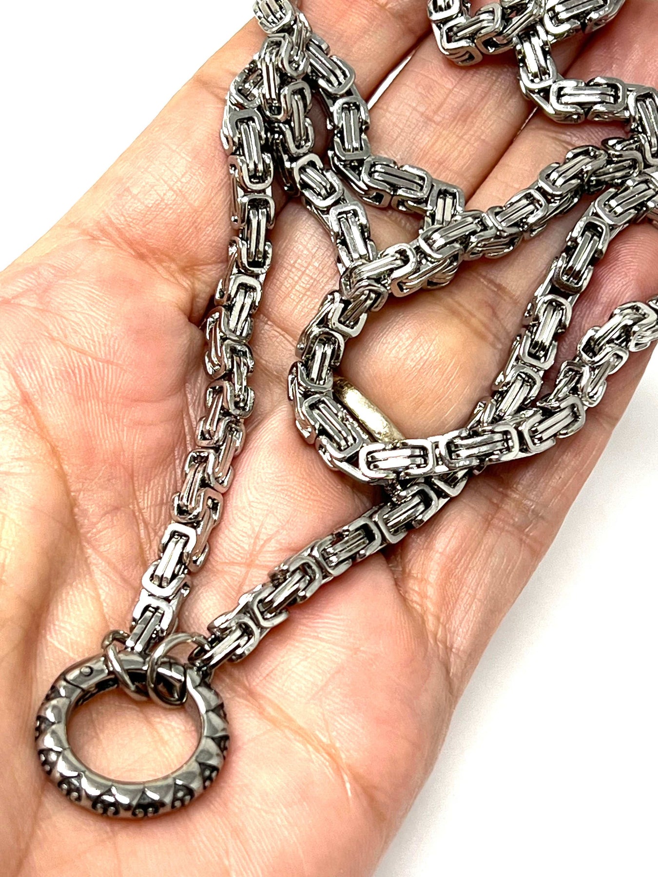 Stainless Steel Thick Byzantine Chain — Beautiful Stainless Steel Thick Chain. All Pendants will look beautiful attached to this chain. Sturdy and stylish, this Stainless Steel "O Ring" Chain is the perfect accessory for any pendant. Made with high-quality stainless steel, this thick chain adds a touch of elegance to any outfit. You'll love how it looks and feels on your neck, and it's sure to make your pendants stand out in all the right ways. Let this chain elevate your style and add a touch of sophistication to your jewelry collection!