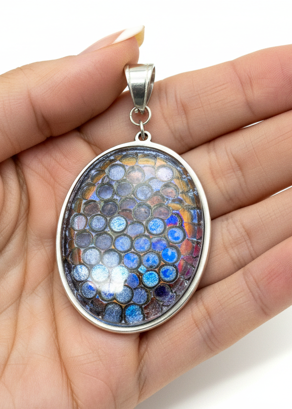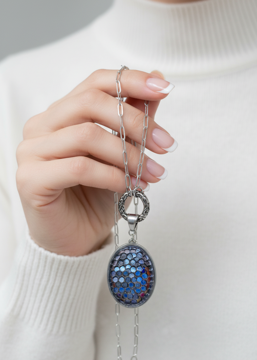 Dazzling brilliance meets timeless elegance in this stunning Blue and Bronze Crystal Mosaic Oval Pendant, a mesmerizing one-of-a-kind work of art. The oval bezel is filled with a captivating mosaic of blue, purple, and iridescent crystals that shimmer and shift with every movement, creating a jeweled tapestry of rich slate blue, deep purple, and warm bronze tones with brilliant rainbow flashes that catch the light like precious gemstones.