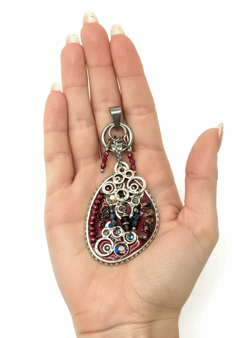 Rich jewel tones and ornate metalwork combine in this exquisite Burgundy Czech Glass Pendant with Silver Filigree, a stunning one-of-a-kind masterpiece. The elegant oval pendant is filled with sparkling burgundy and wine-red Czech faceted glass beads that shimmer with deep, luxurious color, beautifully crowned with an elaborate silver filigree scrollwork overlay and accented with delicate pink and burgundy crystal beads that add romantic sparkle and dimensional texture.