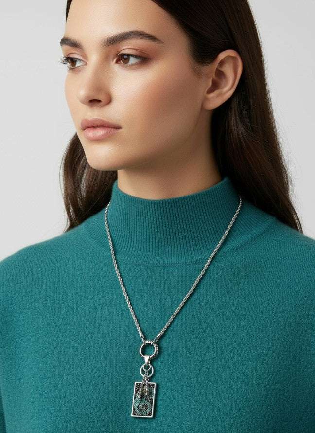 Design: A unique Interchangeable Dangle Pendant featuring a swirling mosaic design set in a fixed bezel.