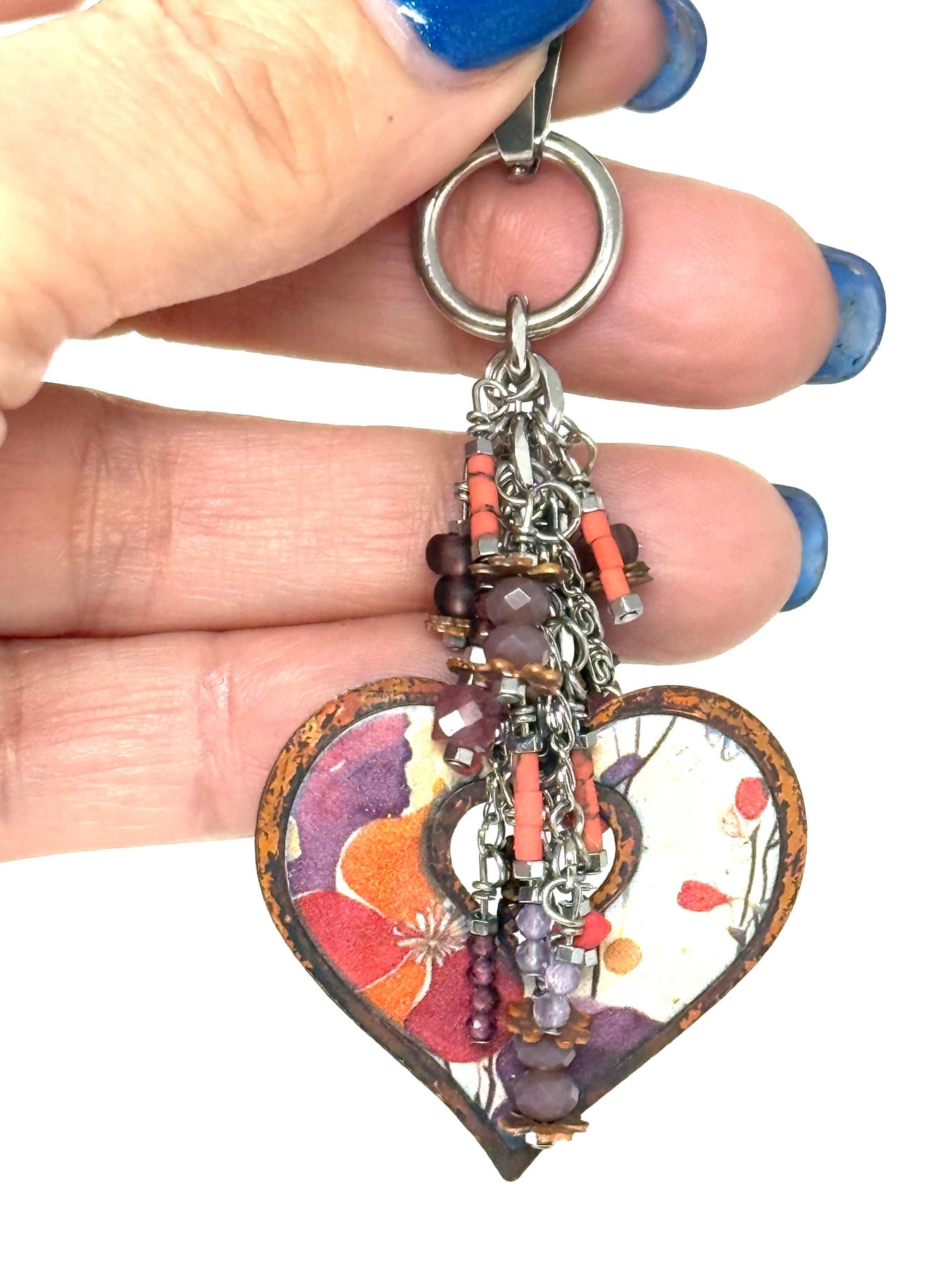 Floral copper enamel heart one-of-a-kind interchangeable beaded pendant with cluster of dangling beads on stainless steel bail - handmade in USA by Bead Dangle Design