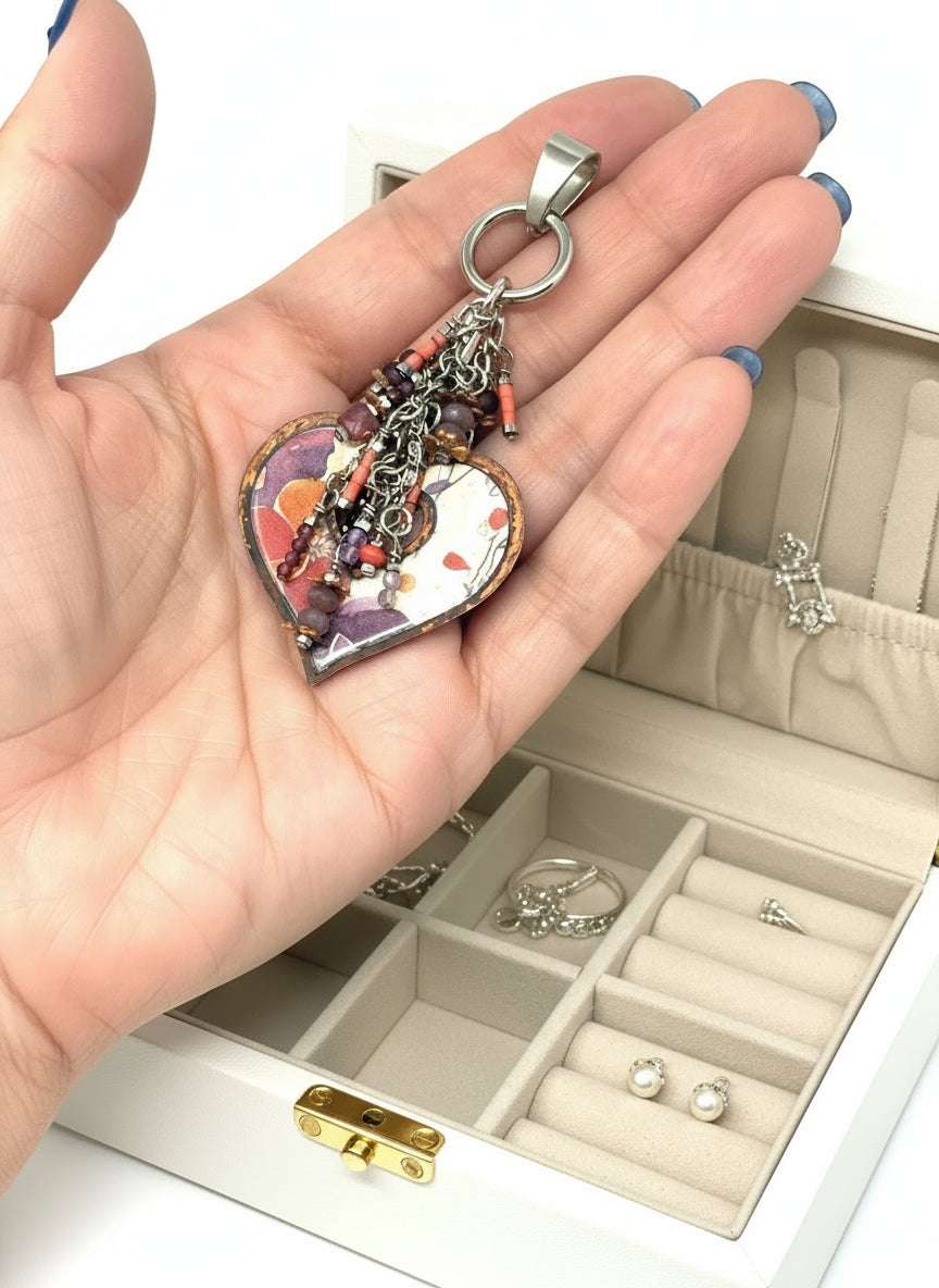 Copper enamel floral heart one-of-a-kind interchangeable beaded pendant held in hand showing cascading bead details - handmade in USA