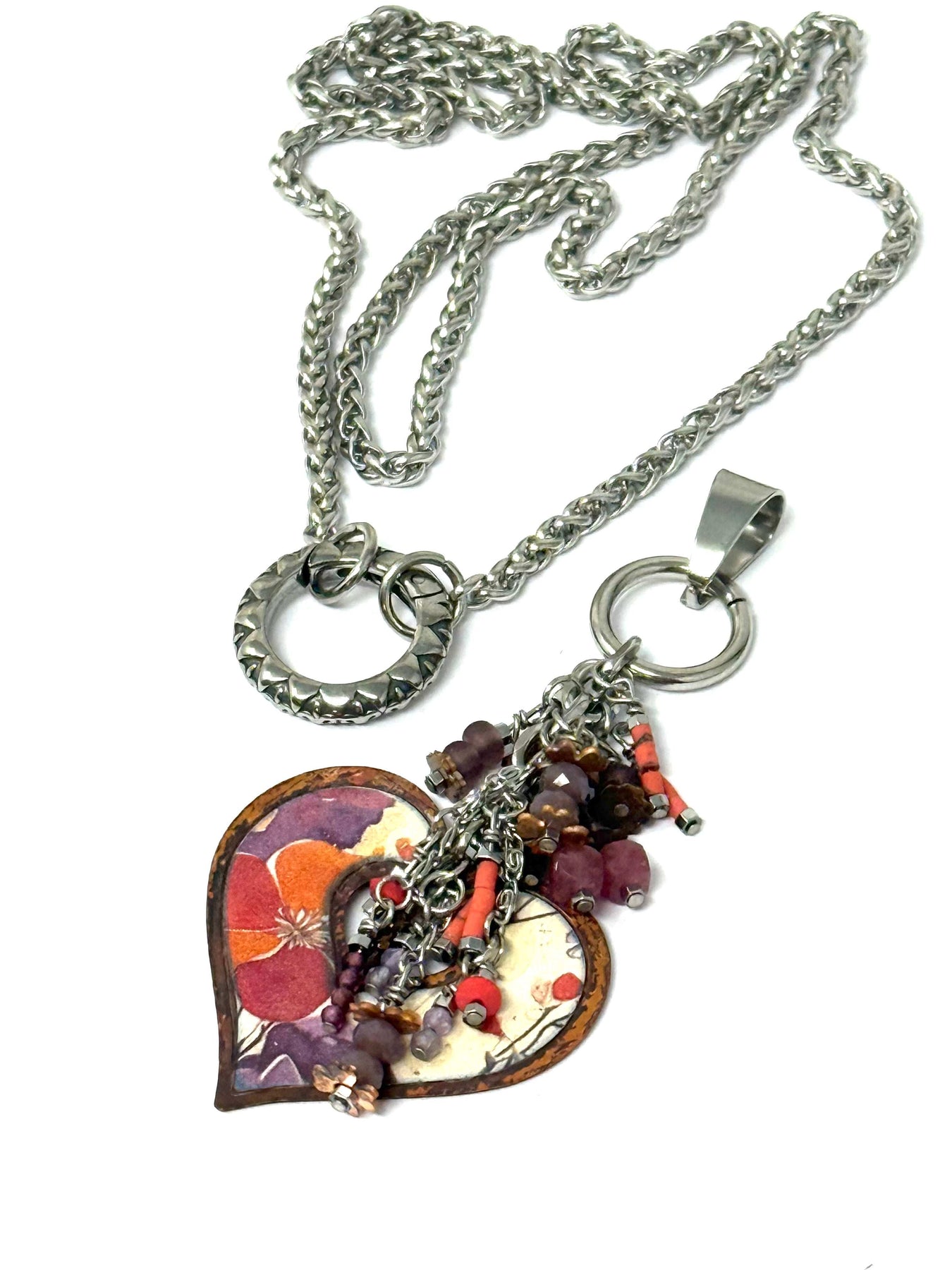 Copper enamel floral heart one-of-a-kind interchangeable pendant necklace with cascading beads in plum, orange, and cream on stainless steel chain - handmade in USA