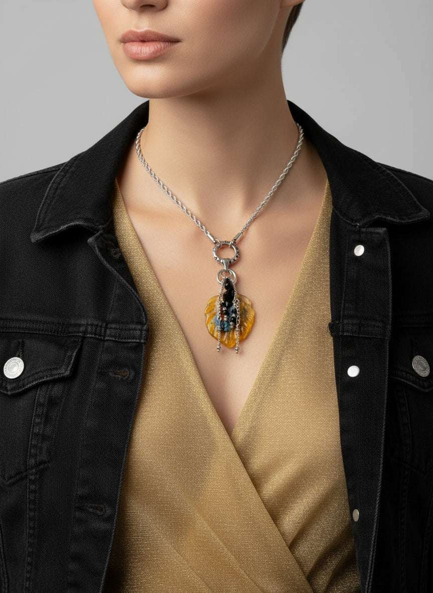 A true testament to fine craftsmanship, this striking Glass Leaf Pendant Necklace is a stunning, multi-color work of wearable art. It features a genuine Glass Leaf Focal Bead complemented by delicate seed beads that add texture and depth.