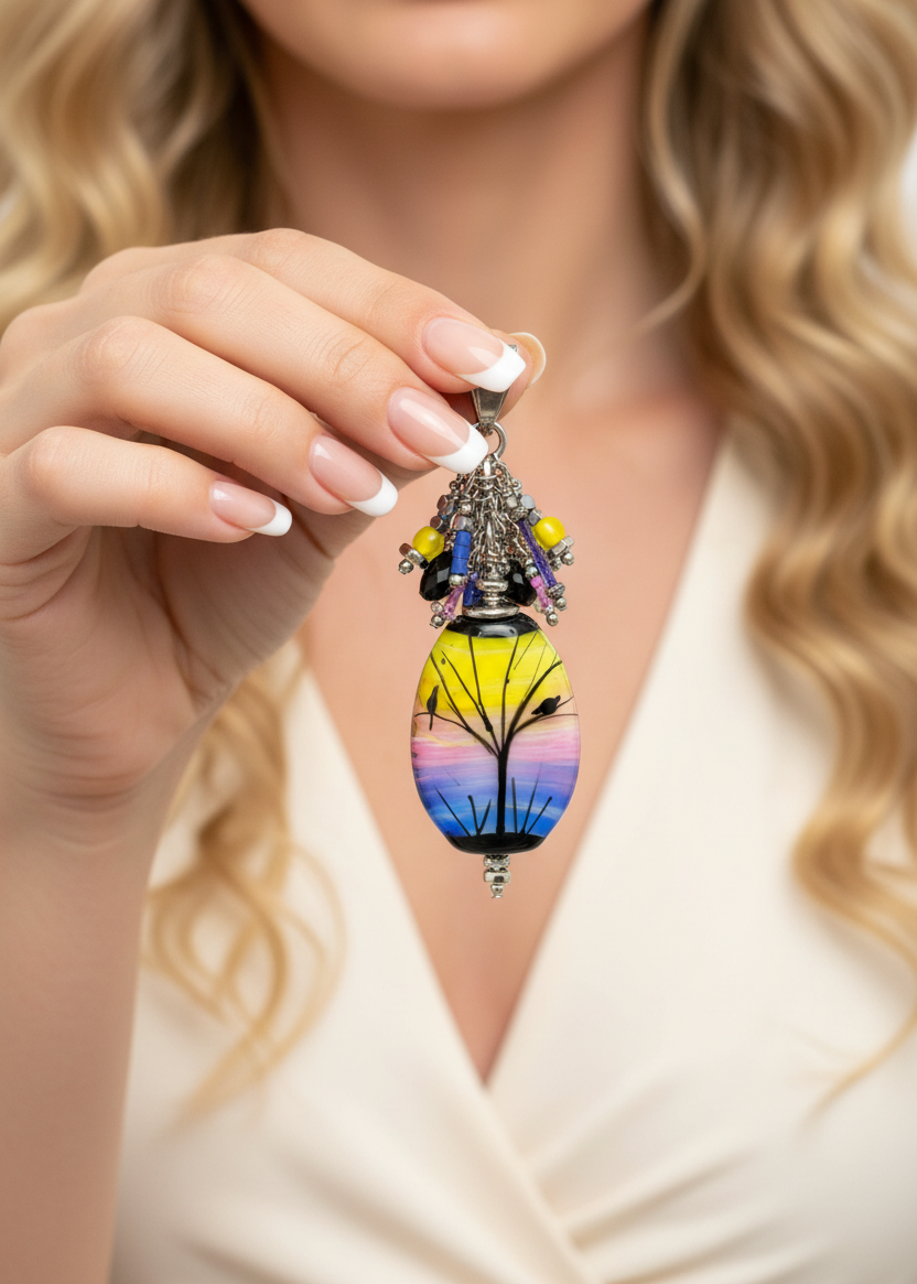 "I get so many compliments when I wear this pendant! The colors are even more vibrant in person, and I love how the hand-painted details make it feel like wearable art. It's become my go-to piece for adding a pop of color to any outfit. People are amazed when I tell them each bead is hand-placed! Knowing it's truly one-of-a-kind makes it even more special!"