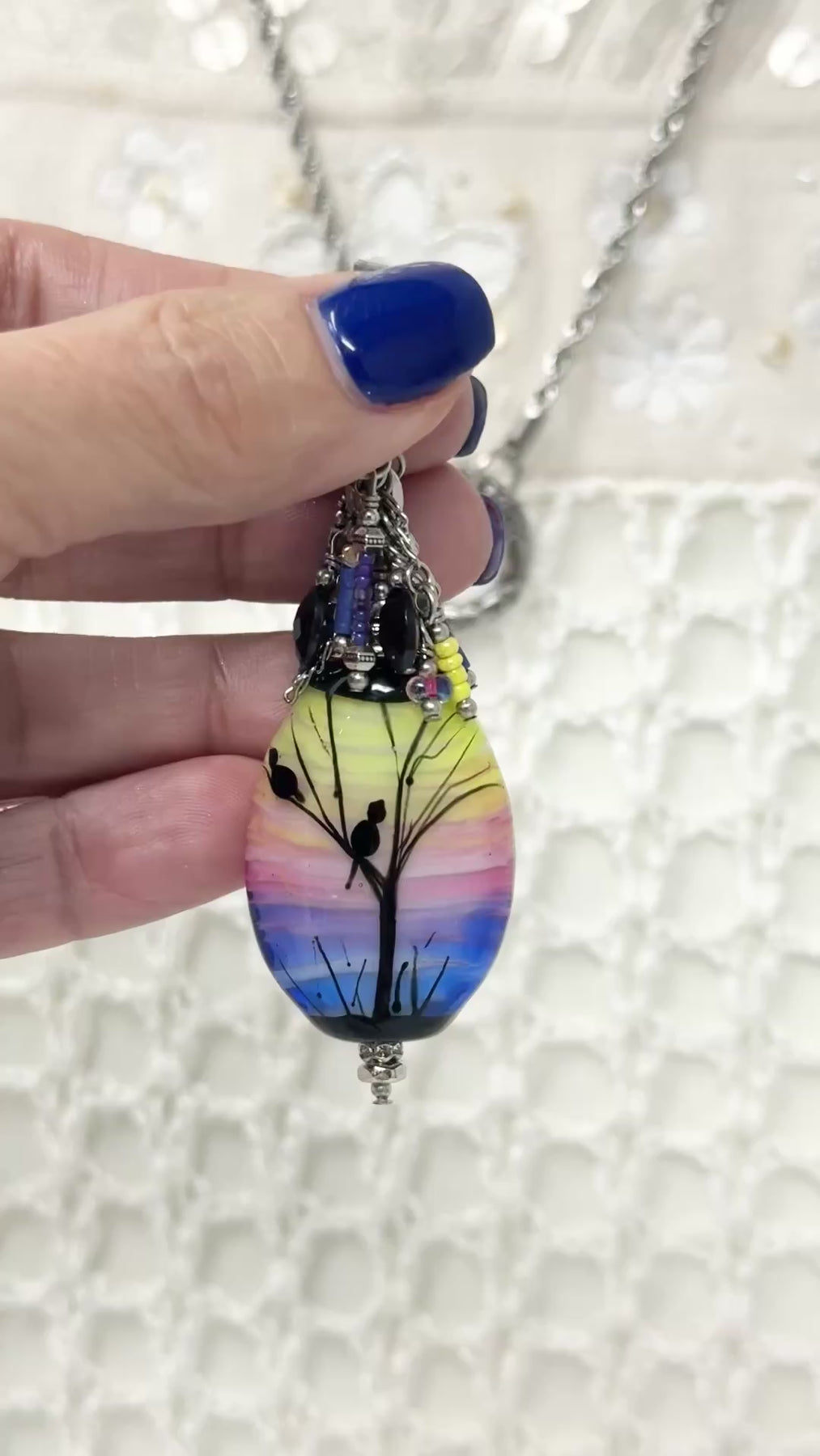 - Focal Bead: Features a stunning hand-painted lampwork glass bead with vibrant gradient from sunny yellow to soft pink to brilliant blue, adorned with delicate black botanical bird silhouettes