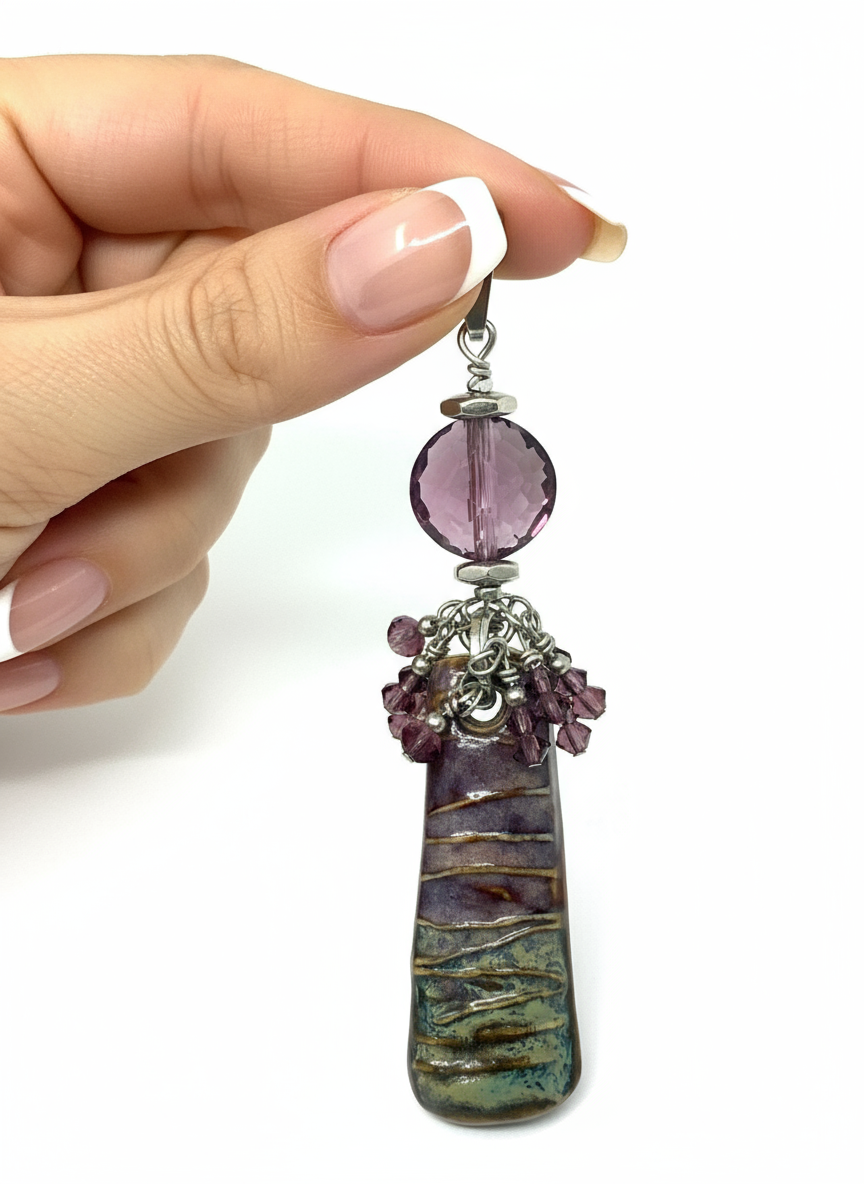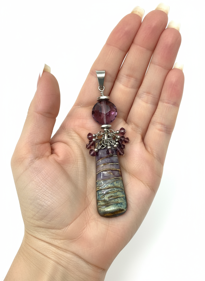 A true testament to fine craftsmanship, this striking Porcelain Swarovski Crystal Dangle Pendant is a stunning, multi-color work of wearable art. It features a genuine Porcelain Focal Bead complemented by delicate Swarovski crystal dangles that add texture and depth.