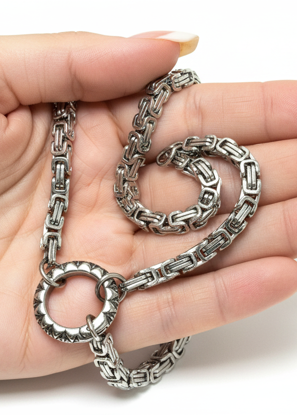 The thick Byzantine weave adds impressive visual weight and strength, making this chain ideal for larger, heavier pendants. The clasp-free circular toggle closure makes changing pendants effortless - simply slide pendants on and off without removing the chain. Available in multiple lengths from 18" to 28", this chain is designed to make a statement while providing the durability you need for everyday wear.