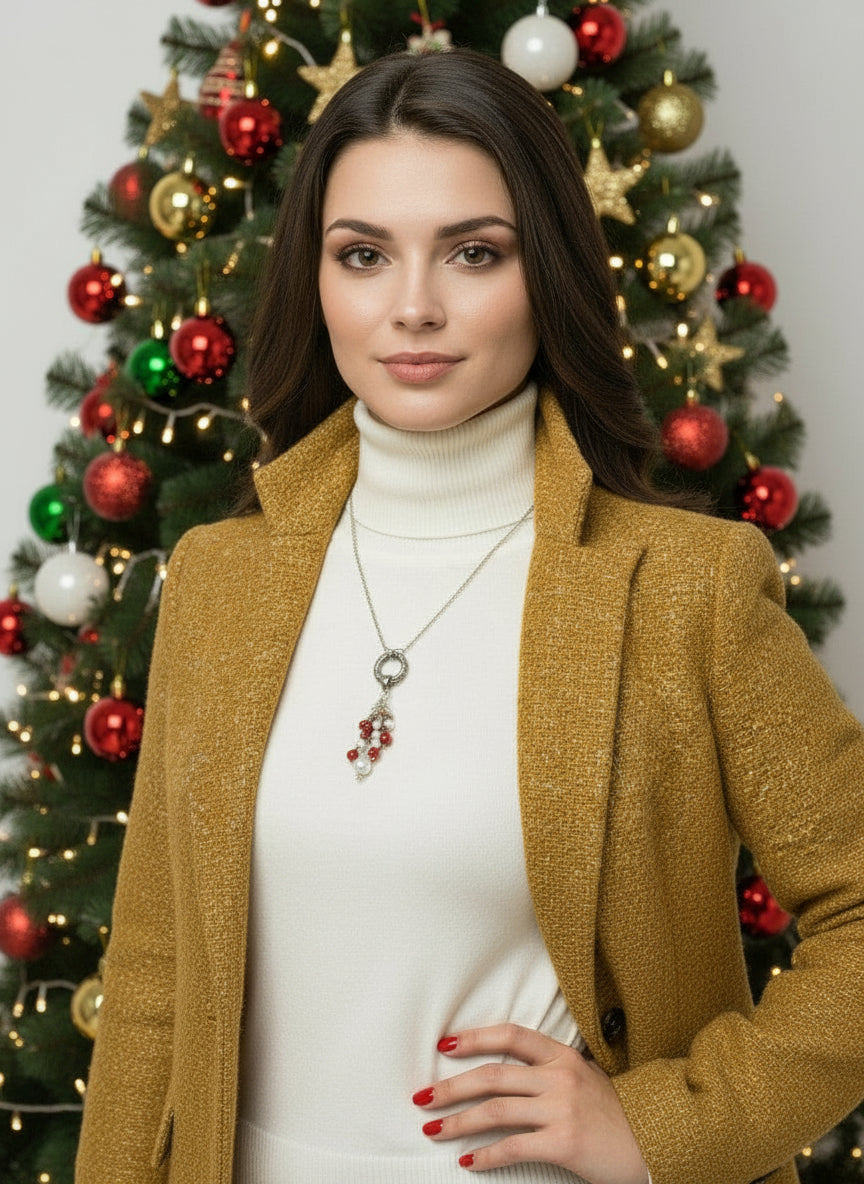 Securely wrapped with stainless steel wire, this handmade piece offers a versatile, artistic touch to any holiday outfit, with colors that catch the light beautifully and create a stunning festive statement.