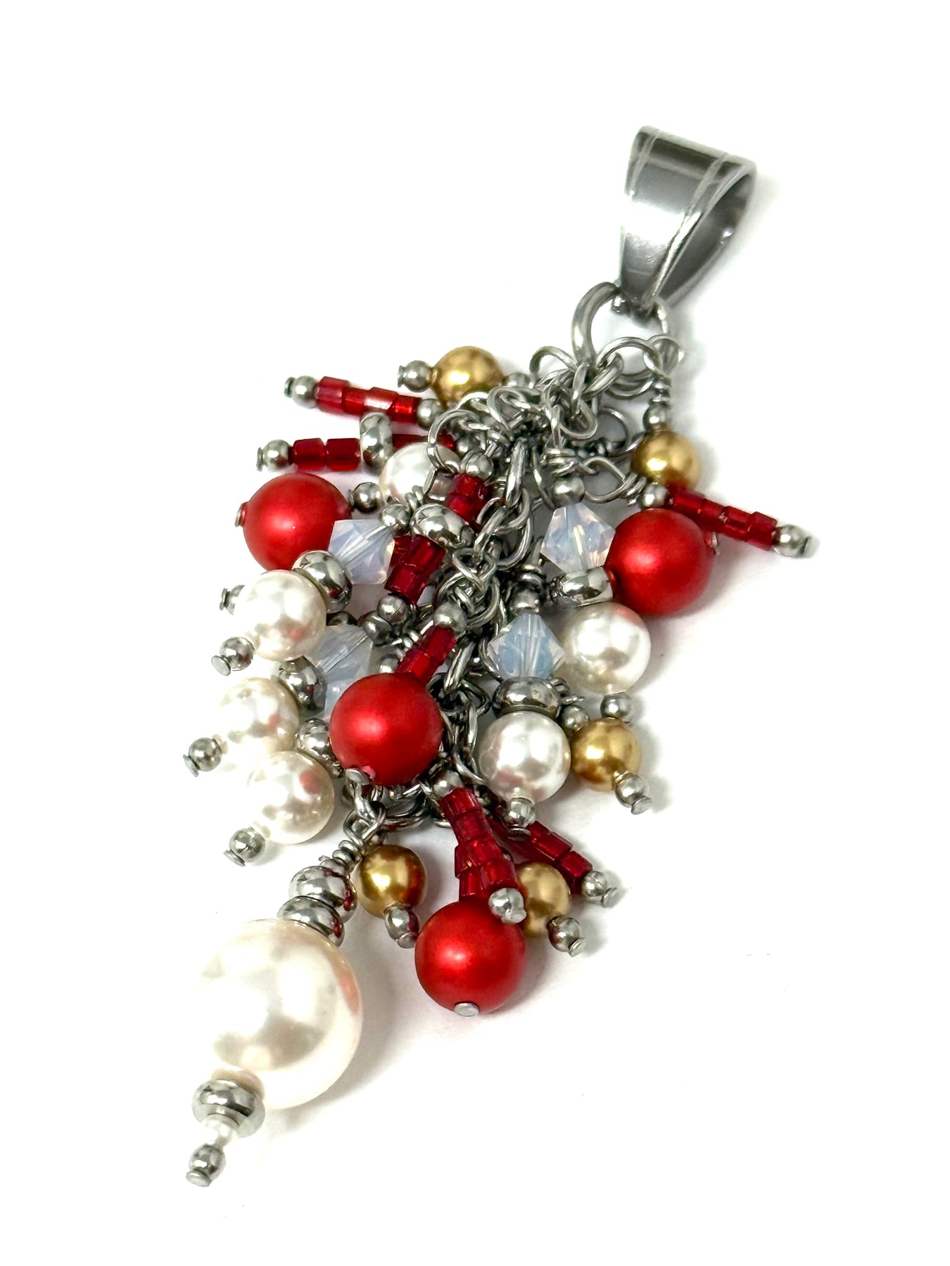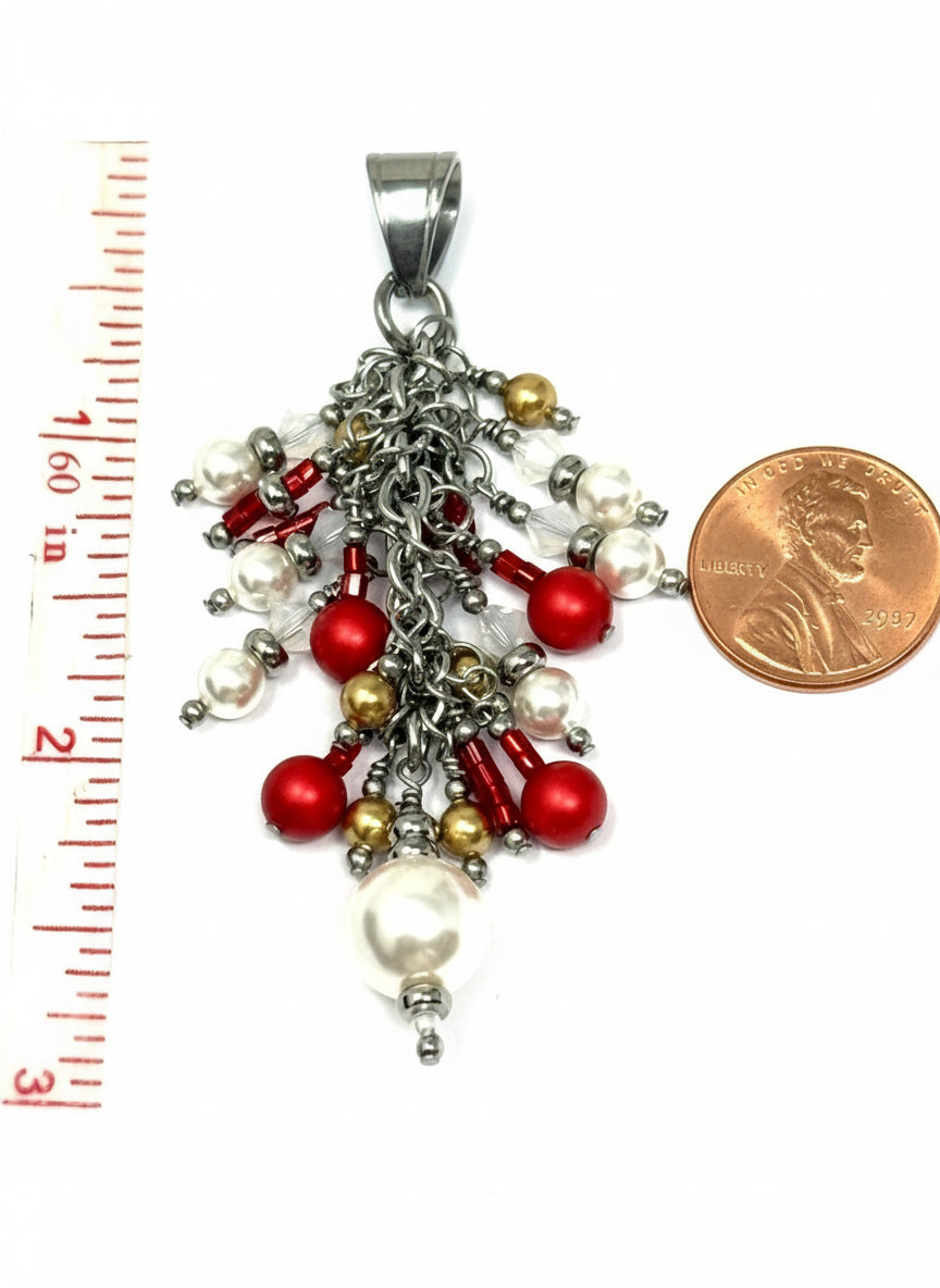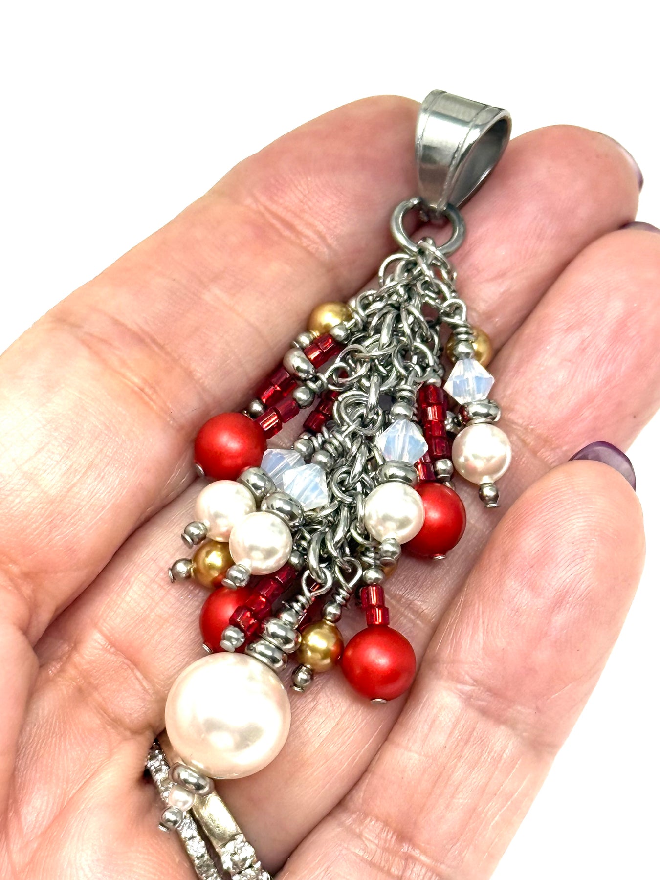 Christmas Holiday Red, White, and Gold Pearl Crystal Cascading Dangle Beaded Pendant #8328D