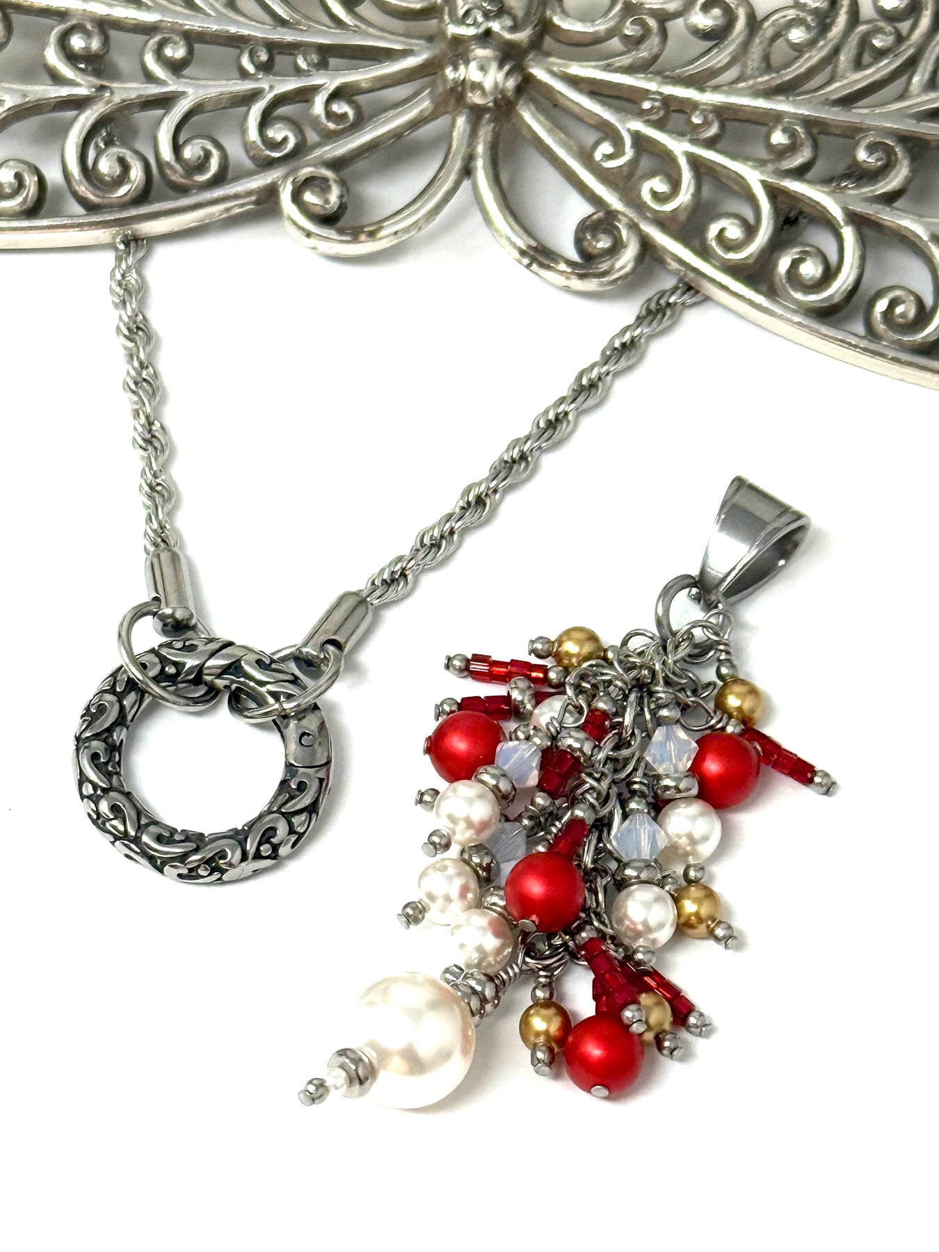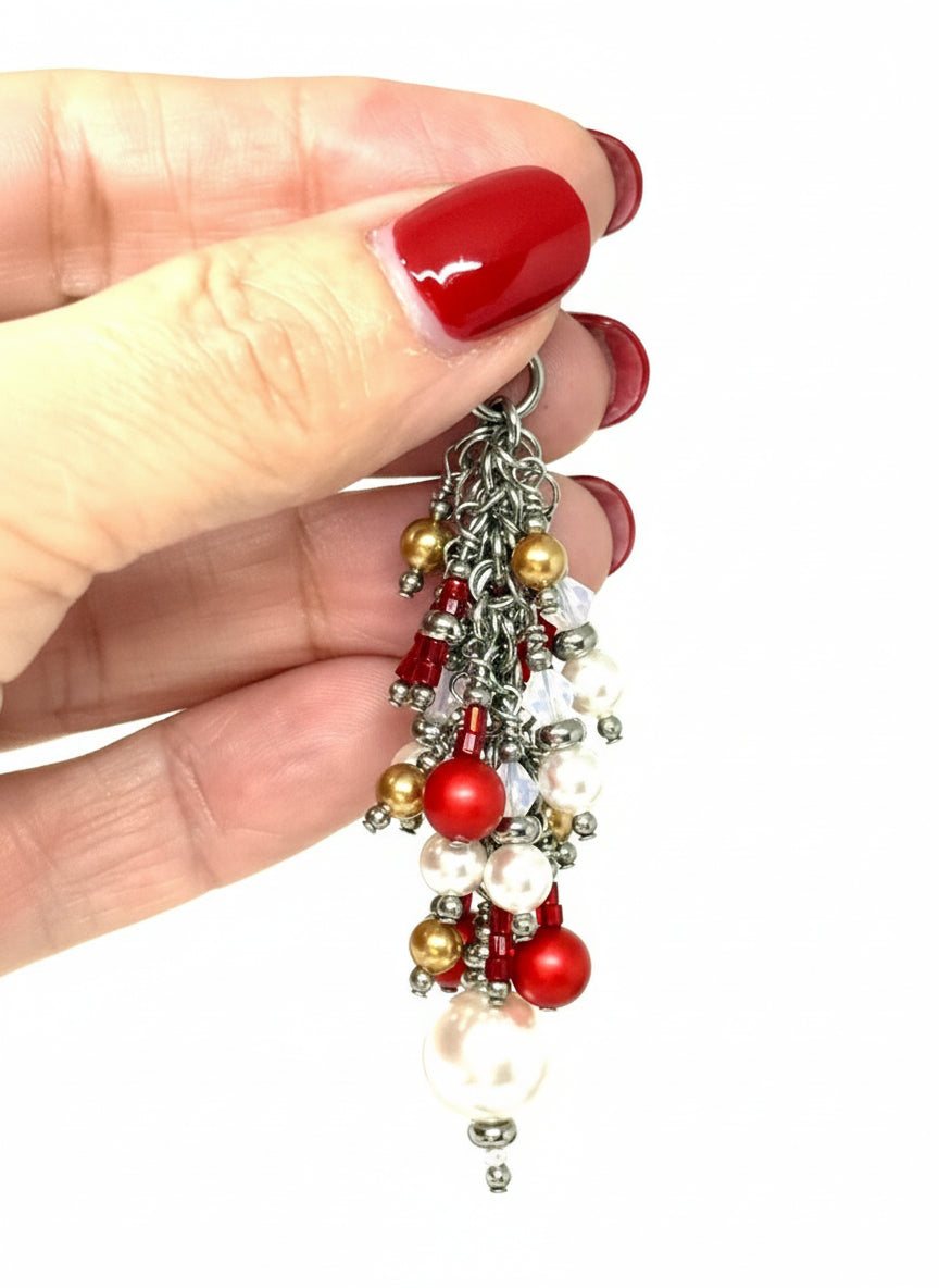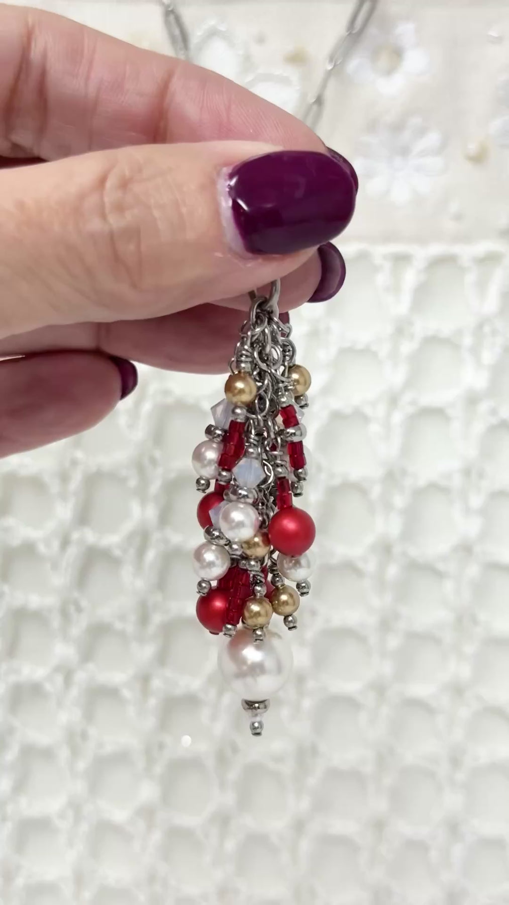 Christmas Holiday Red, White, and Gold Pearl Crystal Cascading Dangle Beaded Pendant #8328D
