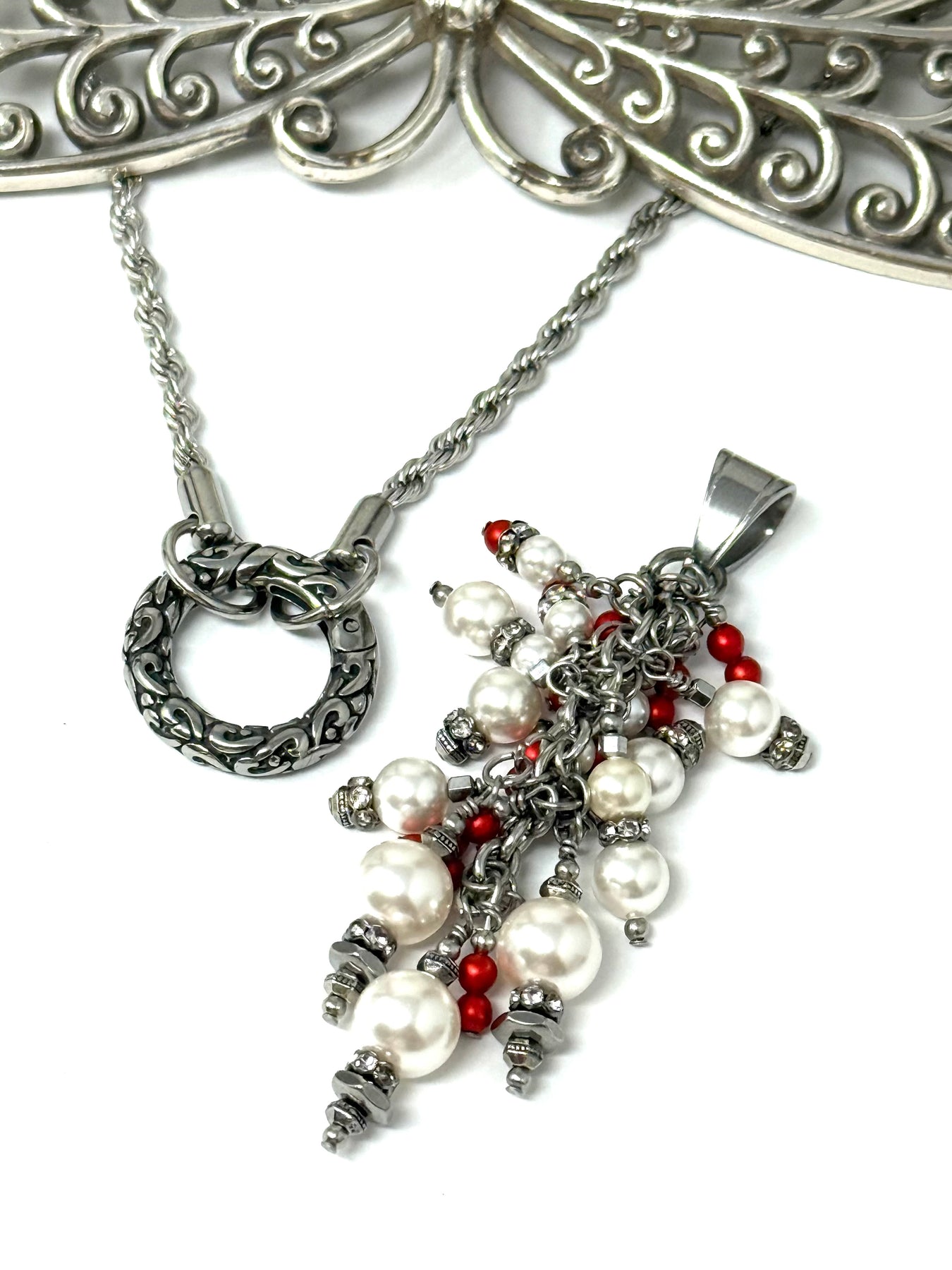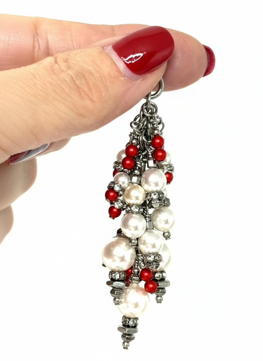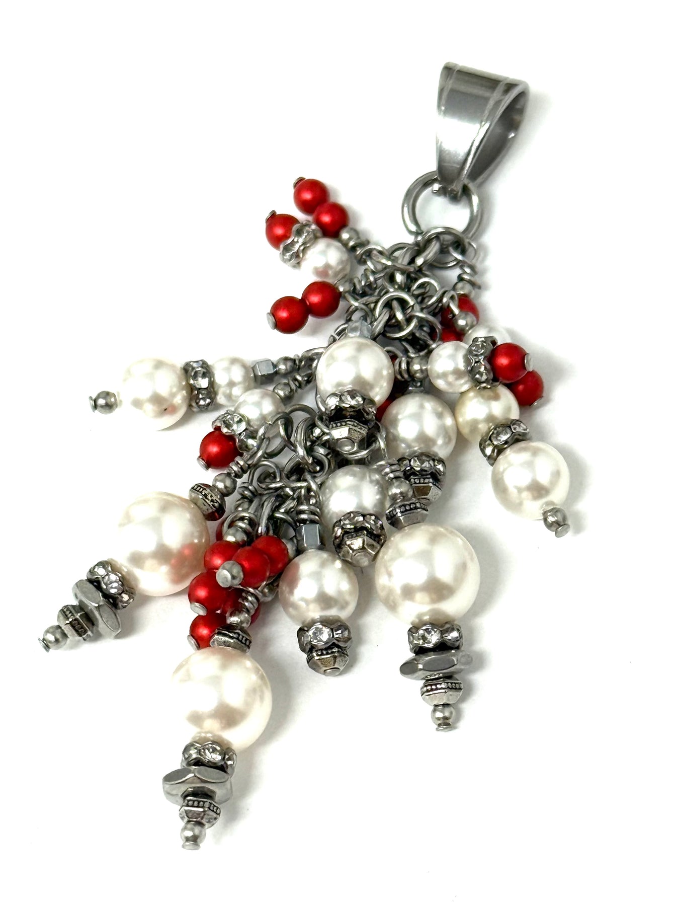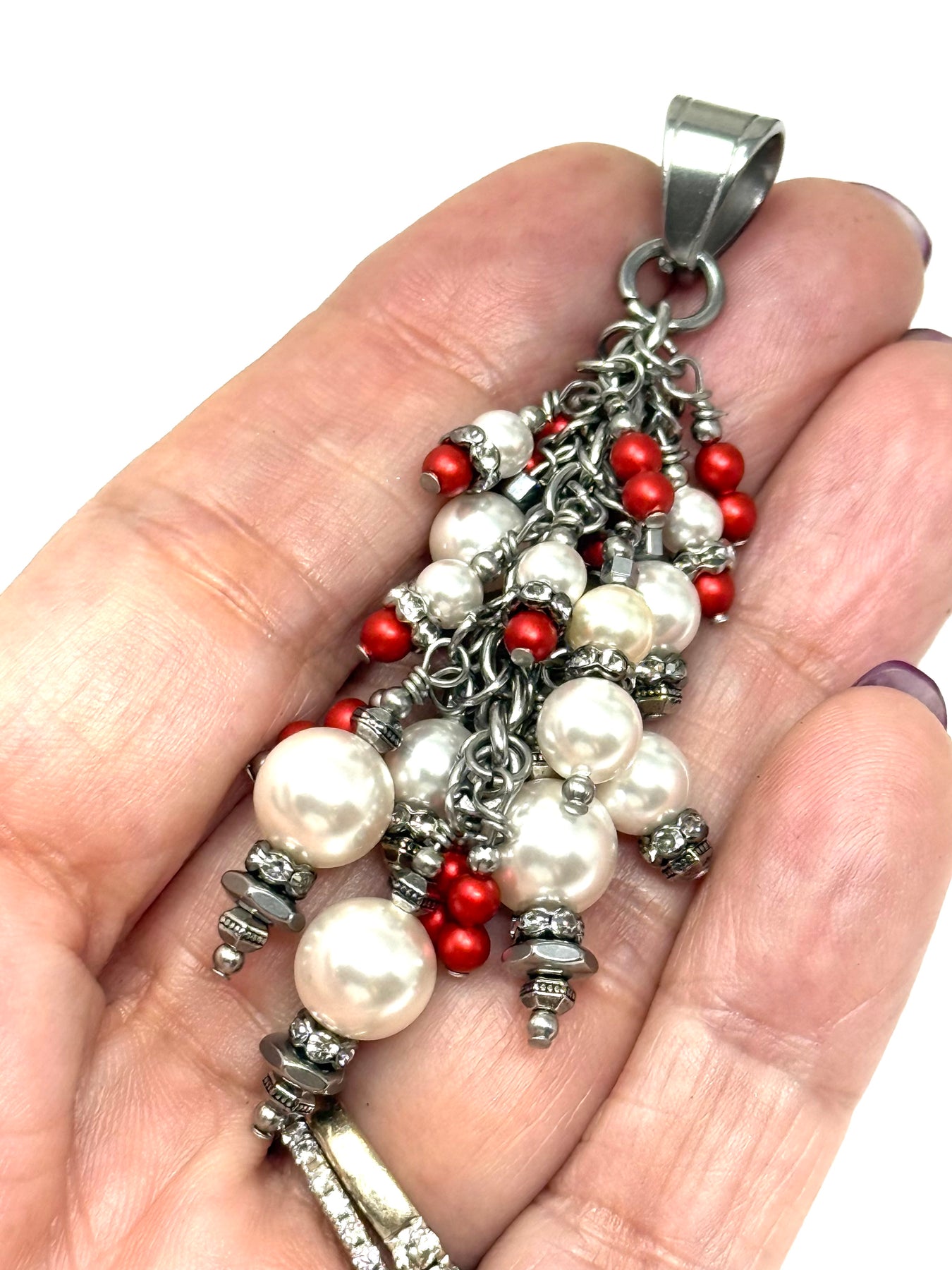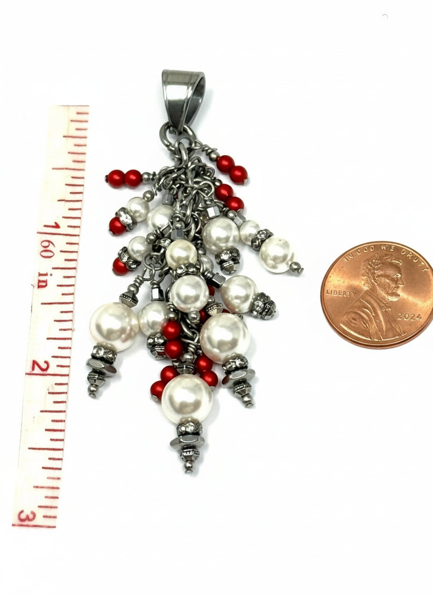 Christmas Holiday Red, White Pearl Crystal Cascading Dangle Beaded Pendant #8327D
