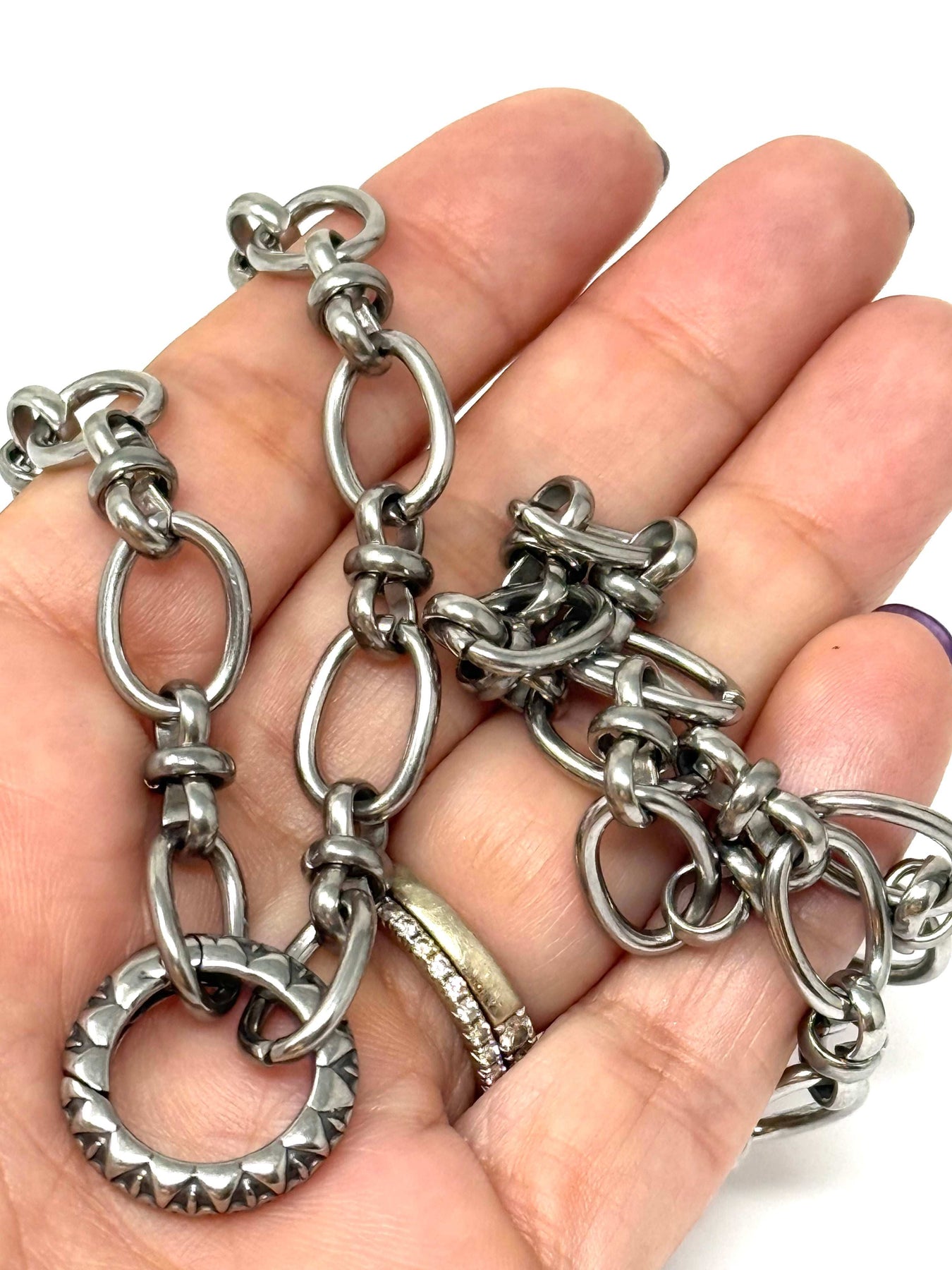 Chunky Oval Link Stainless Steel Chain — All pendants "Slide" onto this chain. This chain is designed for individuals who experience difficulty with their hands. Your pendant slides right onto this chain. All pendants will look beautiful. Sturdy and stylish, this Stainless Steel Chain is the perfect accessory for any pendant. Made from high-quality stainless steel, this elegant chain adds a touch of sophistication to any outfit. You'll love how it looks and feels on your neck, and it's sure to make your pendants stand out in all the right ways. Let this chain elevate your style and add a touch of sophistication to your jewelry collection!