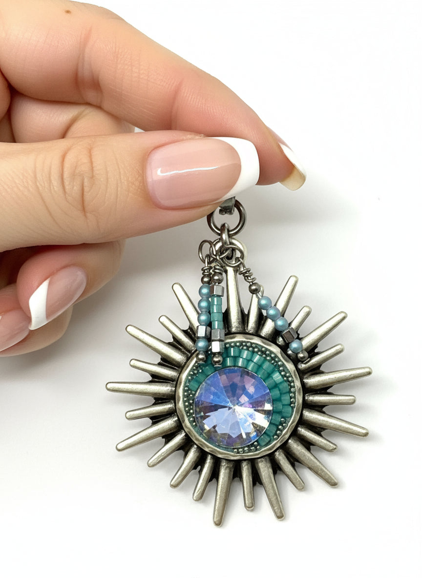 A true testament to fine craftsmanship, this striking Crystal Seed Bead Sun Pendant is a stunning work of wearable art. It features a beautiful sun design with sparkling multi-color crystal seed beads, complemented by delicate accents that add texture and depth.