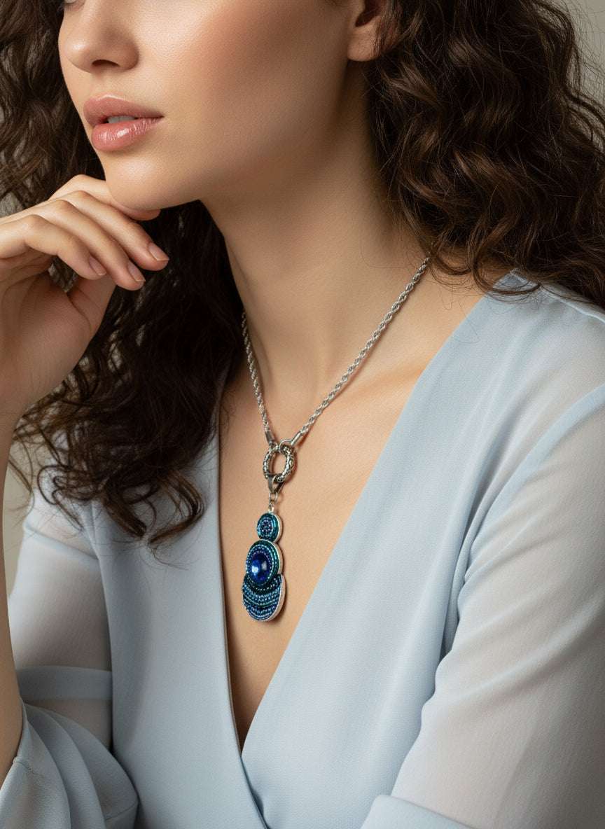 "This deep blue pendant is absolutely stunning! The Austrian crystals have such incredible sparkle and the deep blue color is so rich and vibrant. The Swarovski pearls add such beautiful contrast. It's my go-to pendant when I want to make a statement—the quality and craftsmanship are outstanding!"
