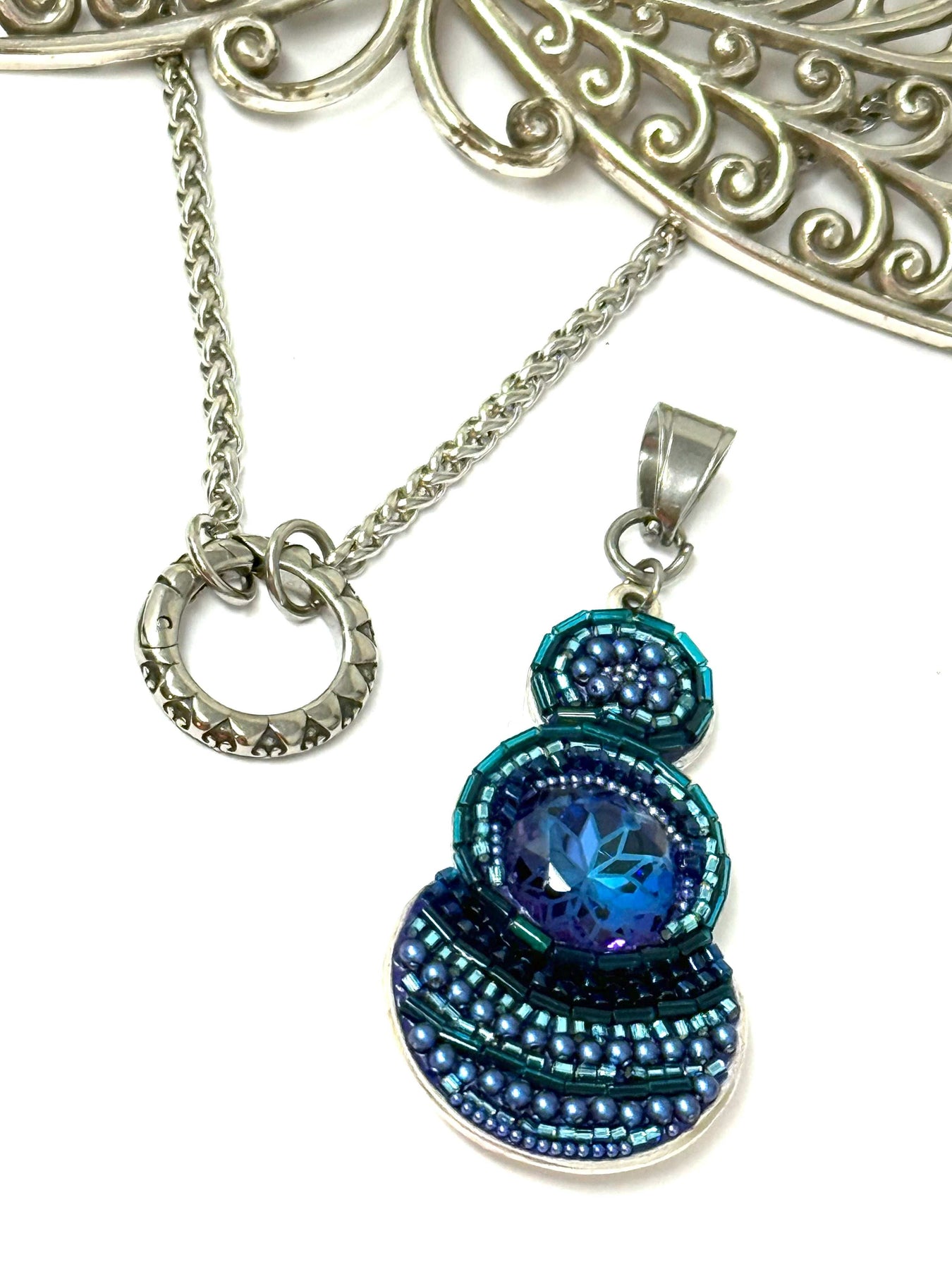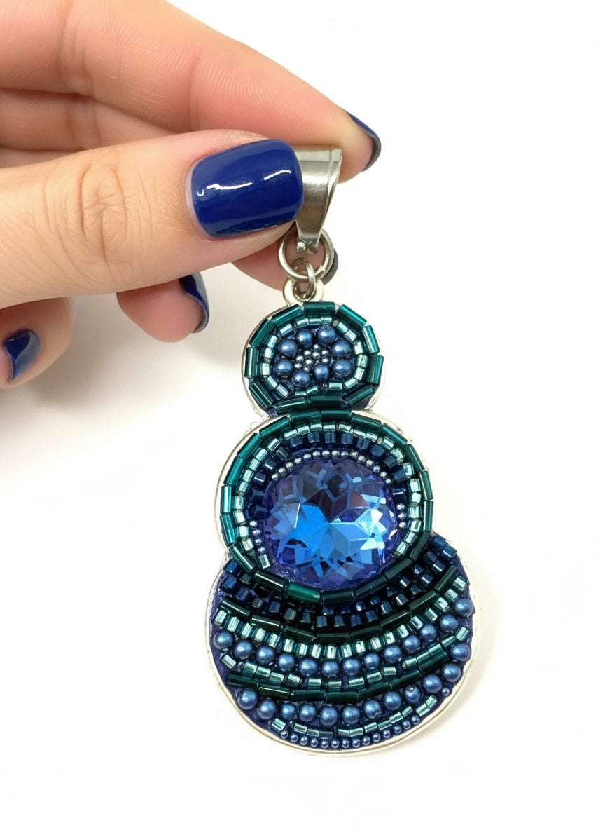Seed Bead Pendant Deep Blue Austrian Crystal - Handmade Jewelry #8253E