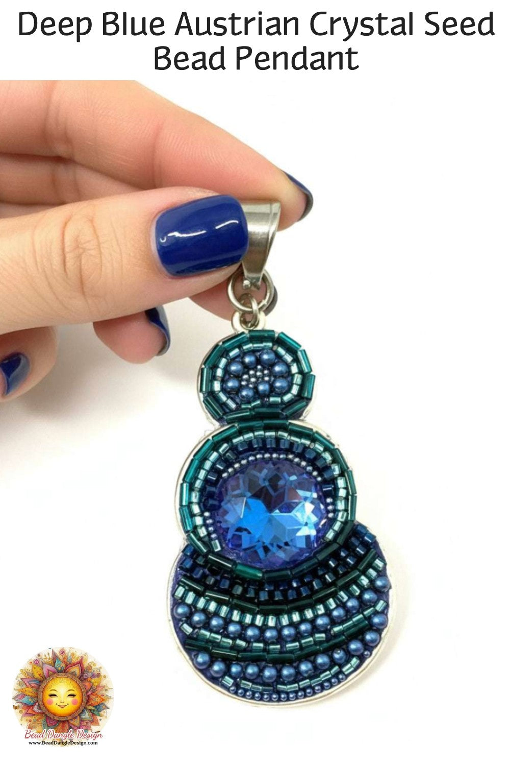 "This deep blue pendant is absolutely stunning! The three-circle stacked design with the seed bead mosaic is so intricate and elegant. The large faceted Austrian crystal has such incredible sparkle and the deep blue color is so rich and vibrant. The Swarovski pearls add such beautiful contrast. It's my go-to pendant when I want to make a statement—the quality and craftsmanship are outstanding!"