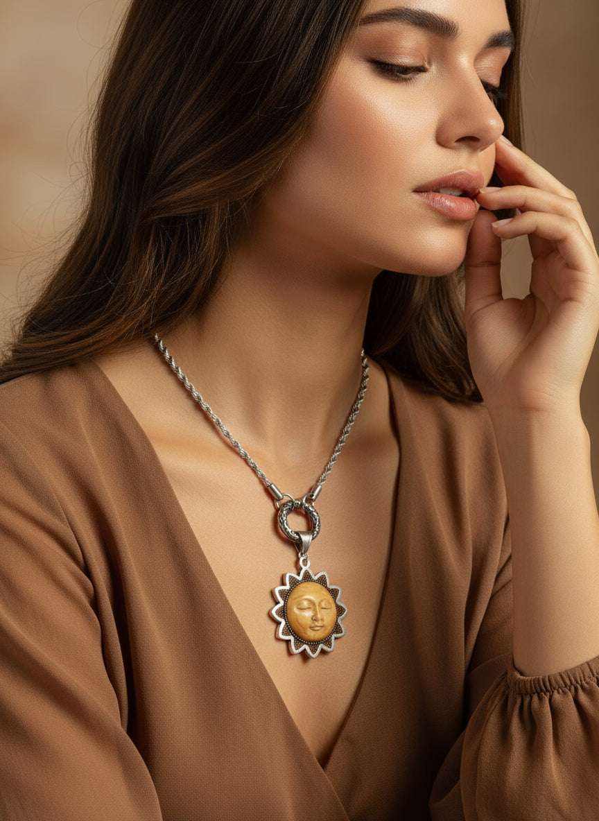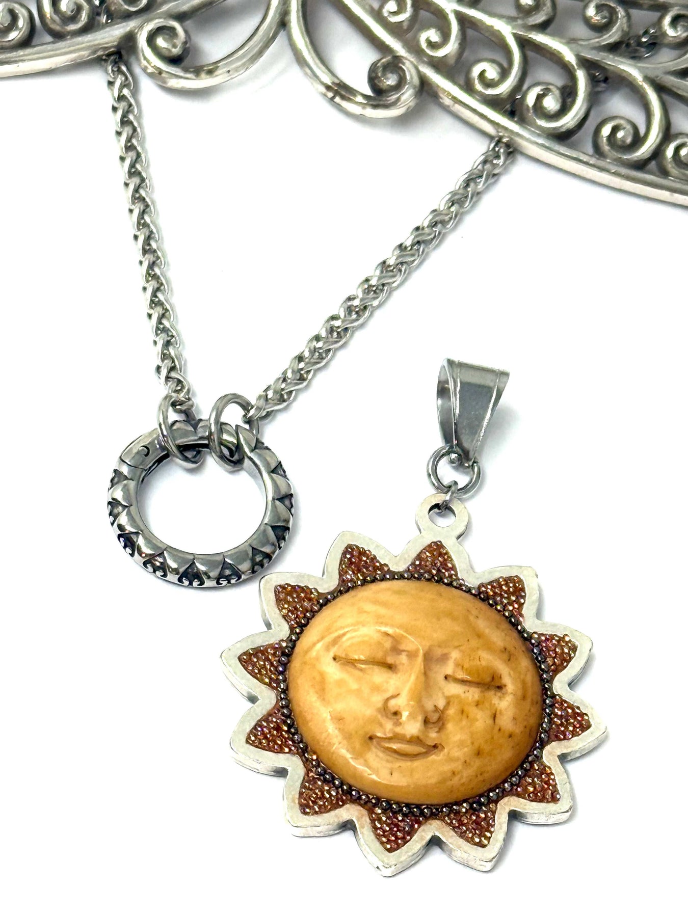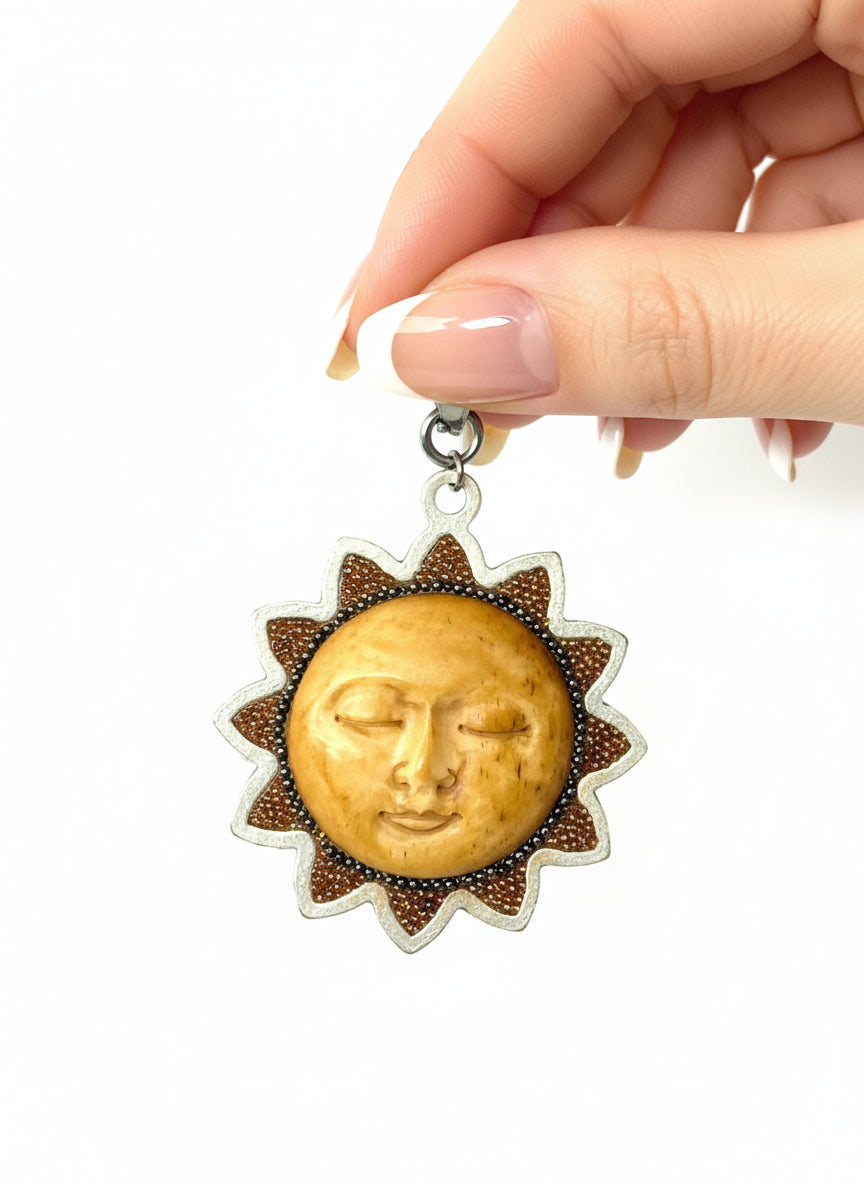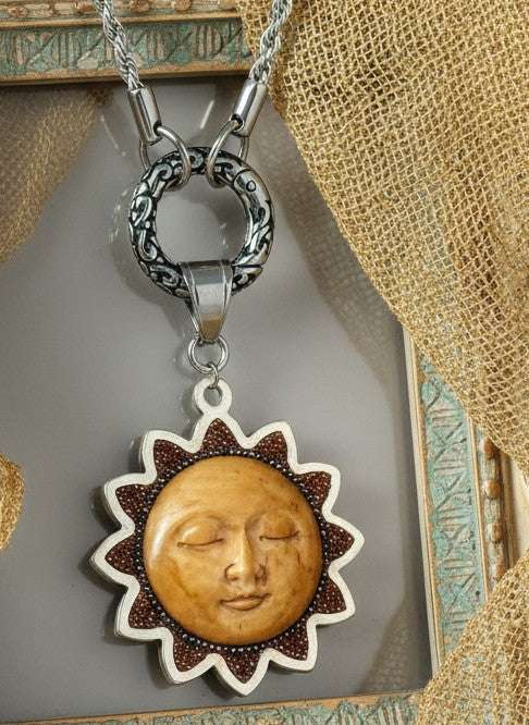 Focal Gemstone: Features a unique Hand-Carved Bone Sun with intricate detail.