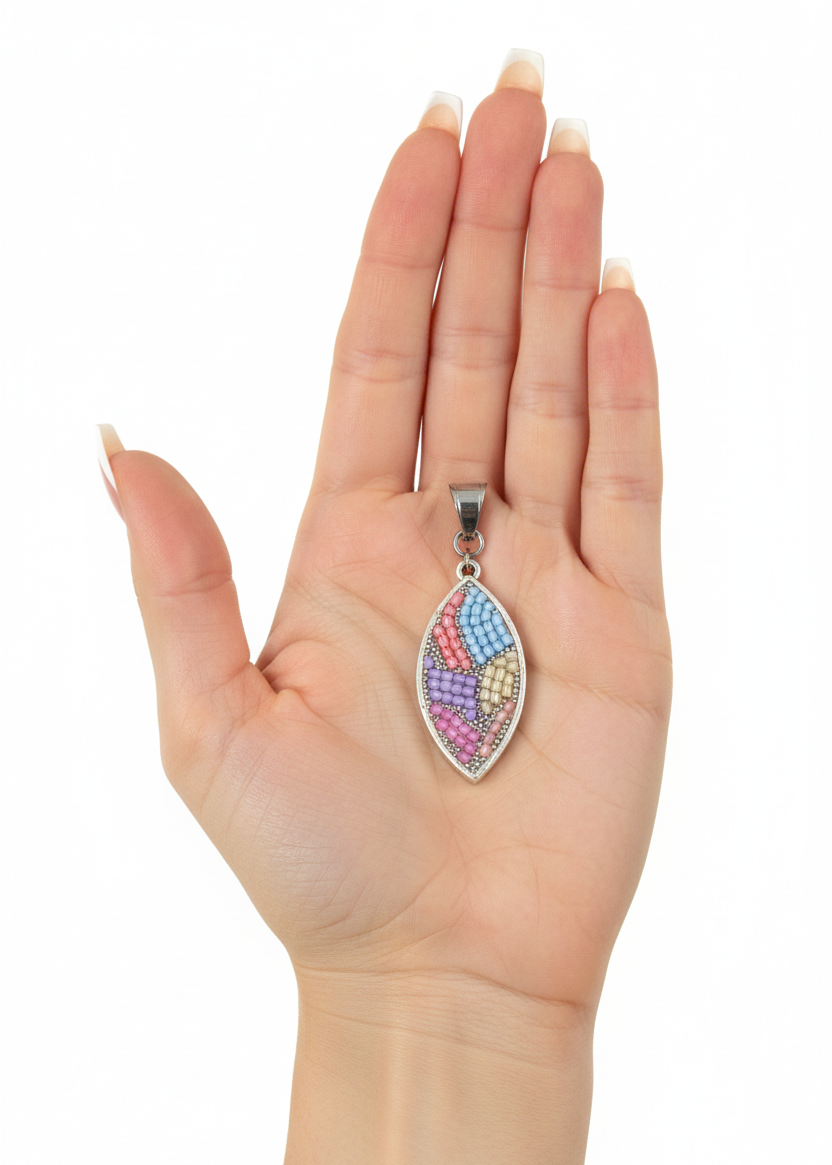 Delicate botanical beauty blooms in graceful curves with this stunning Pastel Seed Bead Pendant, a sophisticated one-of-a-kind work of wearable art. The elegant leaf-shaped pendant features an intricate multicolor seed bead mosaic in soft pink, sky blue, lavender purple, and creamy tan creating a beautiful swirling pattern that flows with organic elegance, all framed by a delicate silver beaded border that adds refined shimmer.